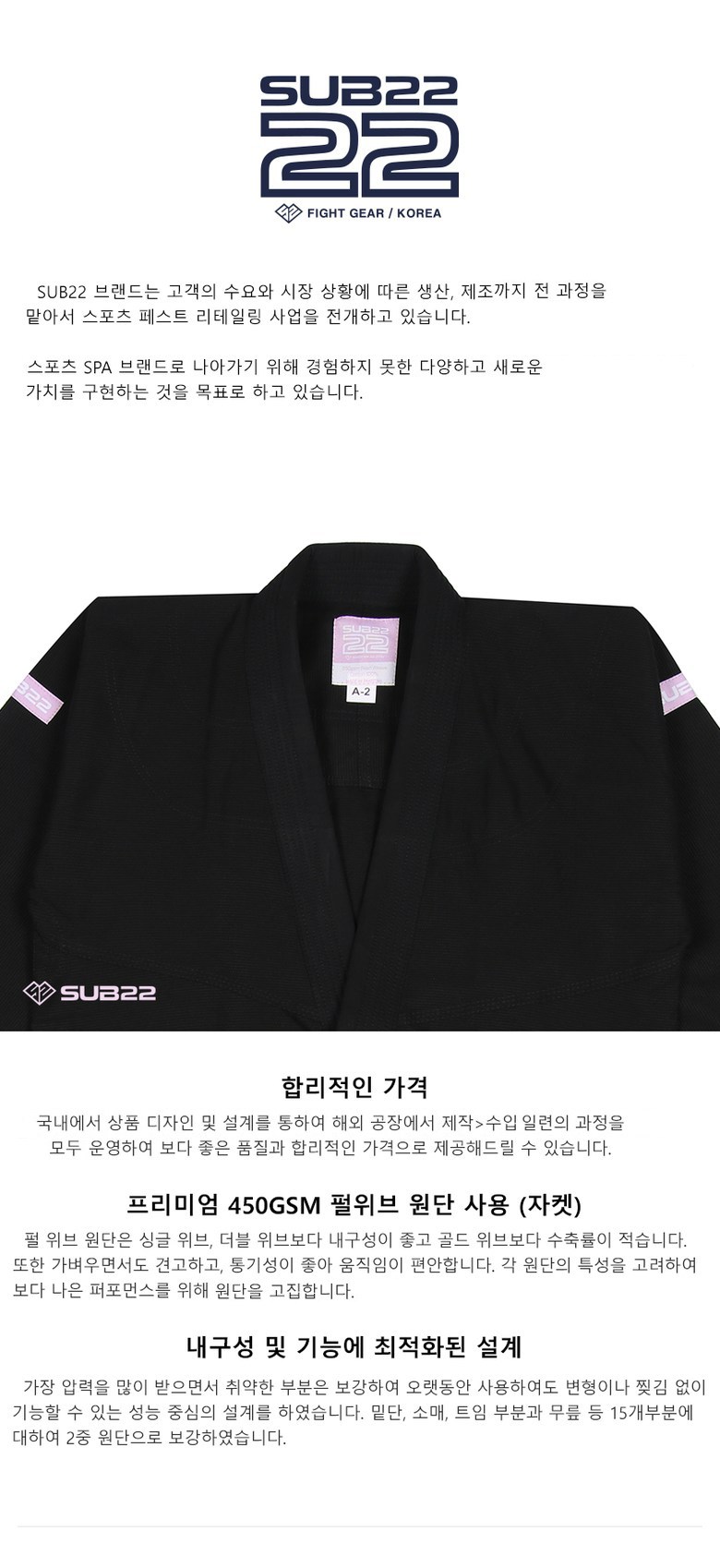 Sub22簡約拼貼柔術服上衣,採用優質450GSM珍珠織紋布料,比傳統布料更耐用且不易縮水。此款上衣在韓國設計,並於海外工廠製造,確保品質與合理的價格。針對耐用性和功能性進行優化設計,在下擺、袖口和膝蓋等15個部位採用雙層布料加固,即使長時間使用也不易變形或撕裂。黑色A0尺寸提供完美貼合,讓您在武術訓練中展現最佳狀態。
