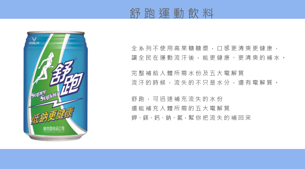 - 舒跑運動飲料,迅速補充運動後流失的水分,讓身體恢復活力,享受運動的暢快。