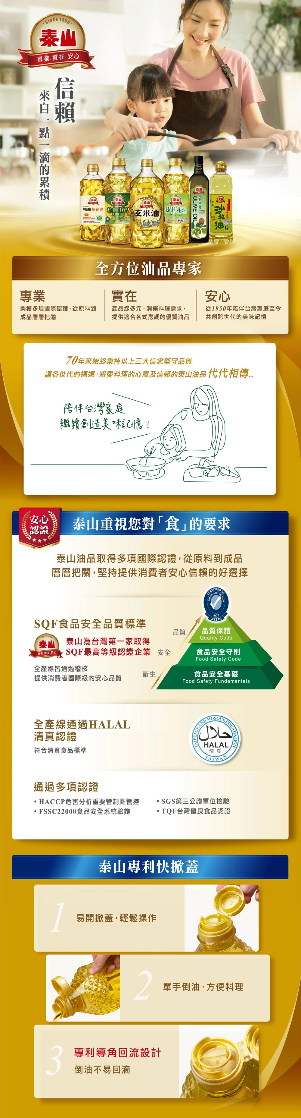泰山大豆沙拉油,精选优质大豆,经过精炼工艺,为您带来安全、健康的食用油。600ml的适中容量,满足您日常烹饪需求。泰山品牌,值得信赖,并通过SQF食品安全品质标准、HALAL清真认证等多项认证,确保产品质量。这款大豆油用途广泛,适用于煎、炒、炸、凉拌等多种烹饪方式,让您轻松制作美味佳肴。采用专利快掀盖设计,易于开启,单手倒油,方便料理,导角回流设计,倒油不易滴漏。
