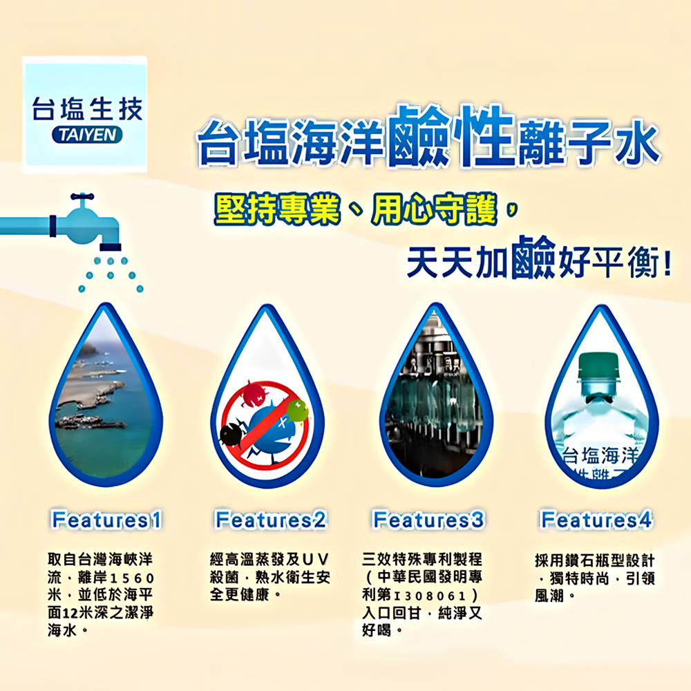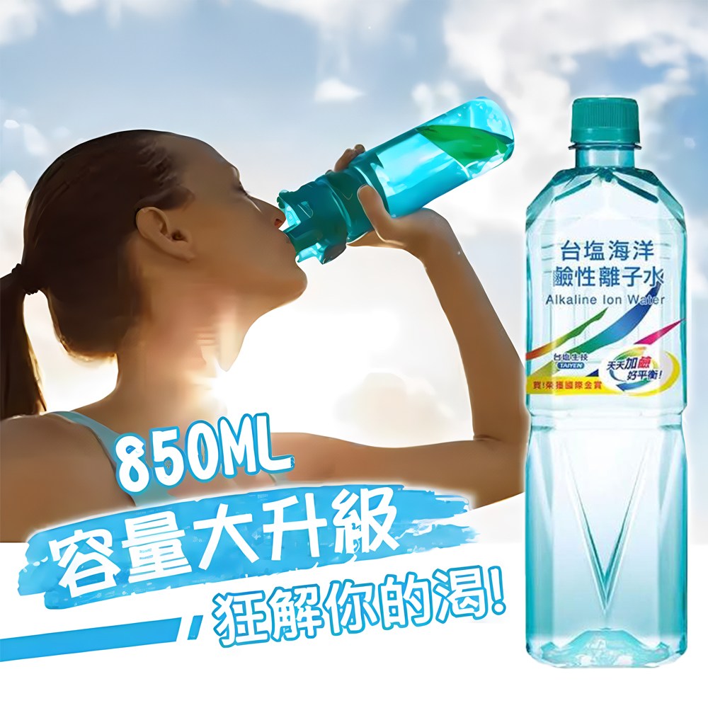 TAIYEN 台塩生技 海洋鹼性離子水,源自台灣純淨海域,經多重過濾與離子交換技術,口感清冽甘甜,為您提供健康補水新選擇。每瓶850ml,方便攜帶,隨時隨地補充水分。台塩生技,品質保證,讓您安心飲用。無論是運動後、工作時,或是日常飲用,海洋鹼性離子水都能幫助您維持身體機能,天天加鹼,健康好平衡!