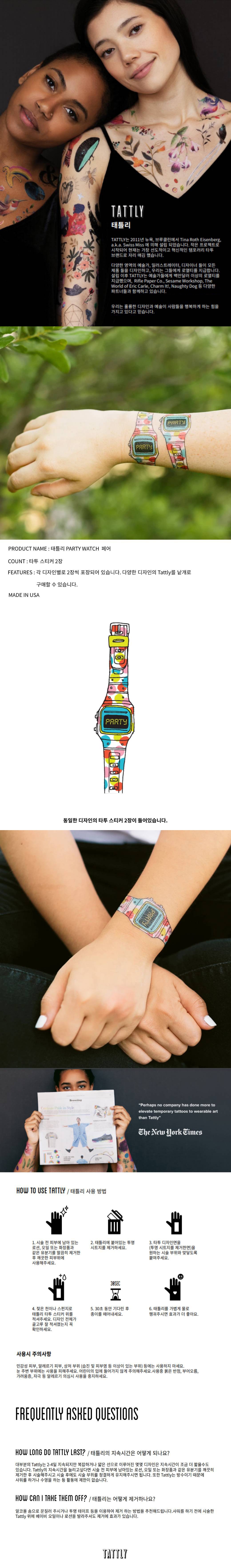 TATTLY 刺青貼紙,派對手錶款式,為您的派對造型增添獨特亮點。每款設計包含兩張紋身貼紙,方便您與朋友分享或替換。使用方法簡單,只需濕布輕壓,即可輕鬆轉印至皮膚,持久度約2-4天。美國製造,讓您使用。無論是參加派對或日常穿搭,都能展現您的個人風格。