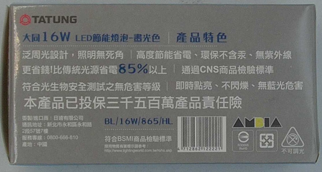 TATUNG 大同 16W LED 節能燈泡,提供明亮且節能的照明解決方案。這款燈泡採用 E27 燈座規格,適用於一般環境照明,讓您輕鬆替換傳統燈泡。16W 的功率提供充足的白光照明,同時節省能源,降低電費支出。此燈泡不可調光,提供穩定的亮度,適合需要持續照明的空間。選擇 TATUNG LED 燈泡,享受高效節能且持久耐用的照明體驗。
