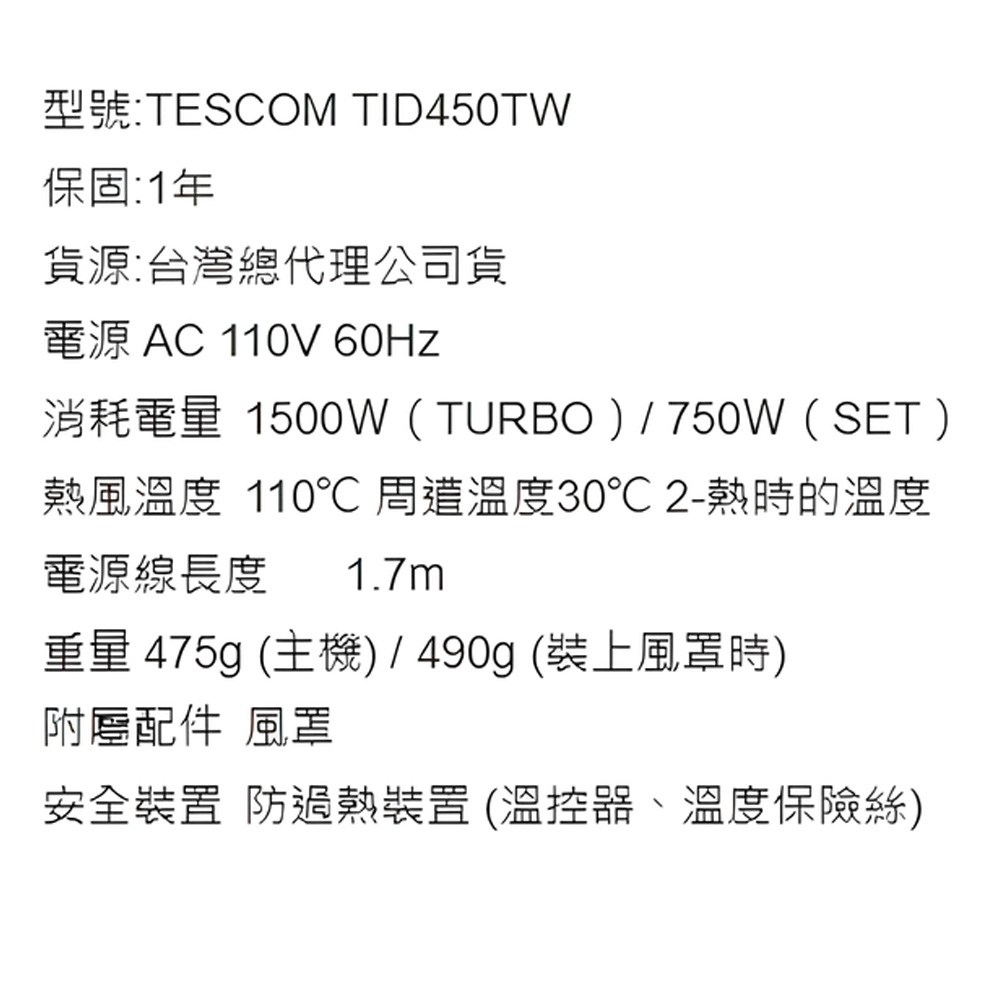 TESCOm 大風量負離子吹風機 TID450TW,讓您在家也能享受沙龍級的護髮體驗。這款吹風機採用遠紅外線技術,能溫和均勻地加熱頭髮,減少熱損傷,同時釋放負離子,中和靜電,使秀髮柔順亮麗。1500W大風量設計,快速吹乾頭髮,節省您的寶貴時間。三段風量調整,滿足不同髮質的需求。粉色外觀時尚可愛,可摺疊設計方便收納,475g輕巧機身,使用不費力。