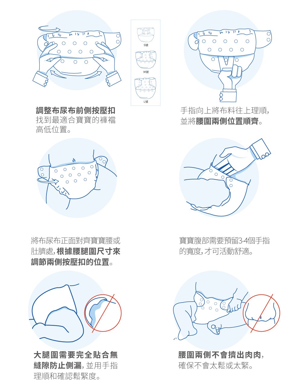 - 獨特的壓扣設計,方便穿脫,調整鬆緊度,讓寶寶隨時保持乾爽舒適。