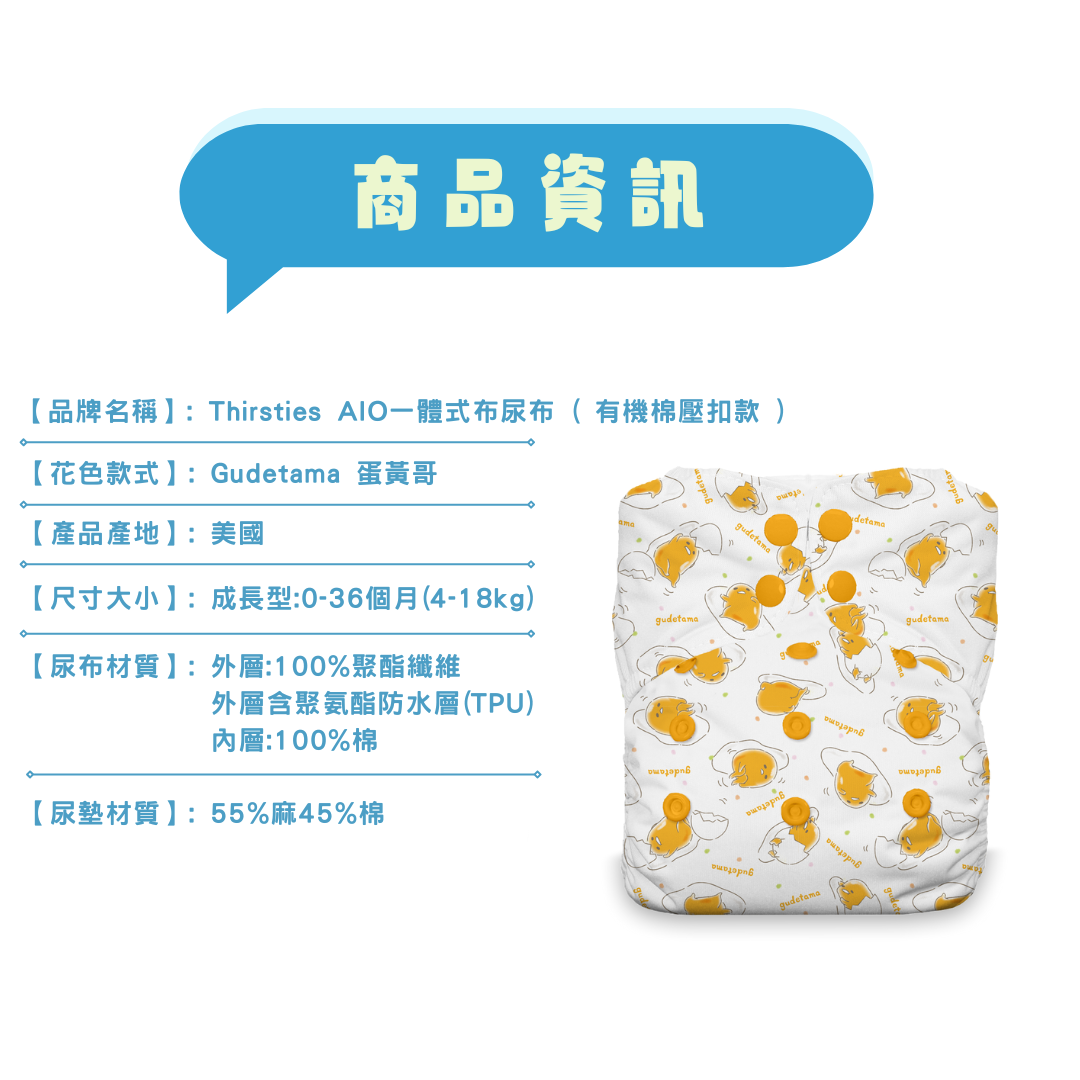 這款THiRSTiES AIO有機棉壓扣一體式布尿布,SANRIO聯名款Gudetama蛋黃哥圖案,可愛又實用。適用於0~36個月,親膚透氣,給寶寶帶來舒適體驗。一體式設計,方便穿脫和清洗,壓扣設計可調節大小,伴隨寶寶成長。Thirsties品牌以高品質和安全性著稱,讓媽媽們安心選擇,還能減少寶寶紅屁屁的發生,是現代父母的理想選擇。