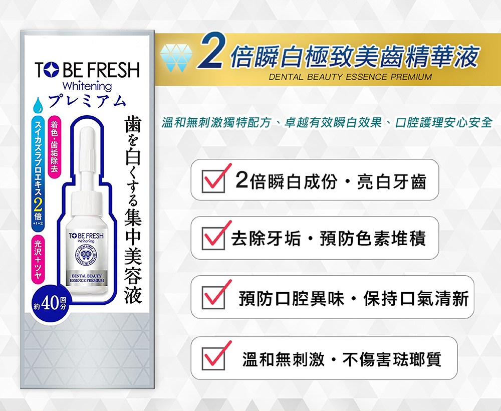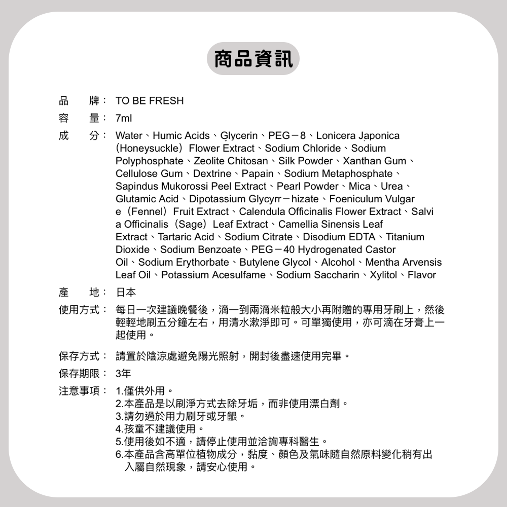 TO BE FRESH 2倍瞬白極致美齒精華液,讓您輕鬆擁有亮白自信的笑容。這款7ml的精華液,採用日本金銀花萃取精華及木瓜酵素,能有效去除牙齒表面的污垢和色素沉澱,恢復牙齒原有的潔白光澤。獨特溫和無刺激配方,不傷琺瑯質,讓您安心使用。每日只需在晚飯後,滴1-2滴在牙刷上,輕輕刷洗五分鐘,即可感受牙齒煥然一新。告別牙齒發黃、色素沉澱的困擾,展現自信笑容。
