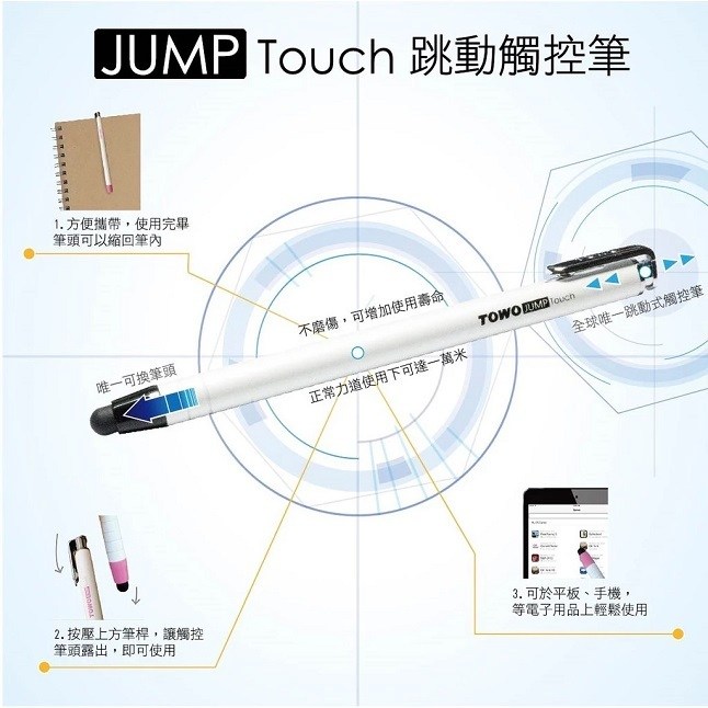 TOWO 東文 JT-300 跳動觸控筆,珍珠銀色,讓您在平板電腦或智慧型手機上享受流暢精準的書寫體驗。這款觸控筆採用獨特的跳動式筆頭設計,提供靈敏的回饋,讓您輕鬆繪圖、書寫筆記或瀏覽網頁。珍珠銀色的筆身時尚優雅,搭配耐用的材質,確保長時間使用。無論是學生、上班族或藝術家,TOWO 東文 JT-300 觸控筆都能提升您的數位創作效率,讓您的想法躍然紙上。此外,其輕巧的設計方便攜帶,隨時隨地都能使用。