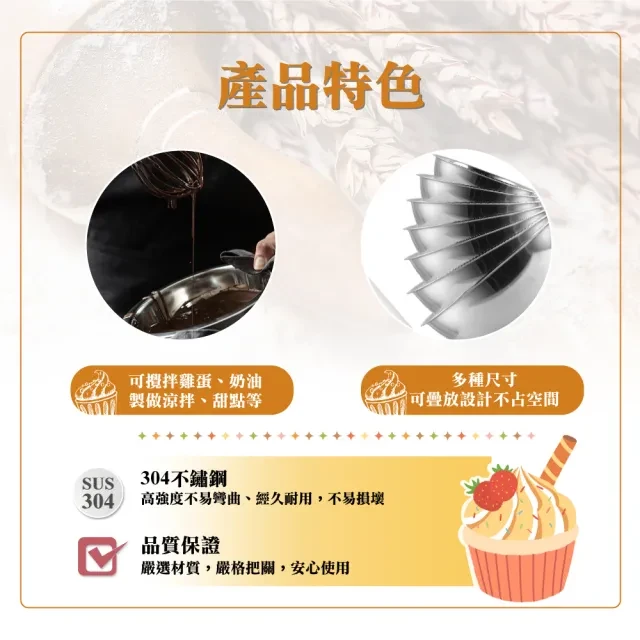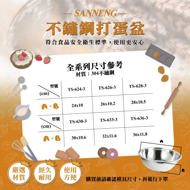 這款24公分的304不鏽鋼打蛋盆(型號TS-624-3)是您廚房裡不可或缺的好幫手。採用優質不鏽鋼材質,堅固耐用,不易變形,讓您安心使用於各種烹飪需求。無論是攪拌麵糊、打發蛋白,或是準備沙拉,這款打蛋盆都能輕鬆勝任。其光滑的表面易於清潔,且可用於洗碗機,省時省力。24公分的尺寸適中,方便收納,是烘焙愛好者和專業廚師的理想選擇。