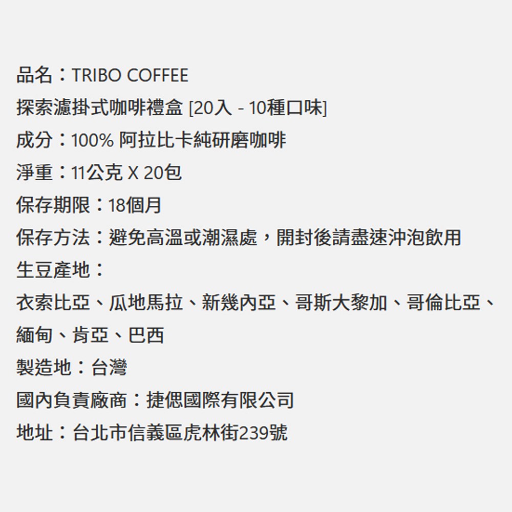 TRIBO COFFEE探索濾掛式咖啡禮盒,為您帶來一場豐富的咖啡探索之旅。這款禮盒包含10種不同風味的濾掛式咖啡,讓您一次品嚐多種獨特風味。嚴選阿拉比卡咖啡豆,由冠軍烘豆師精心烘焙,確保每一杯咖啡都擁有最佳的口感和香氣。濾掛式設計方便快捷,讓您隨時隨地都能輕鬆享受一杯高品質的精品咖啡。精美禮盒包裝,無論是送禮或自用,都能展現您的品味與心意。