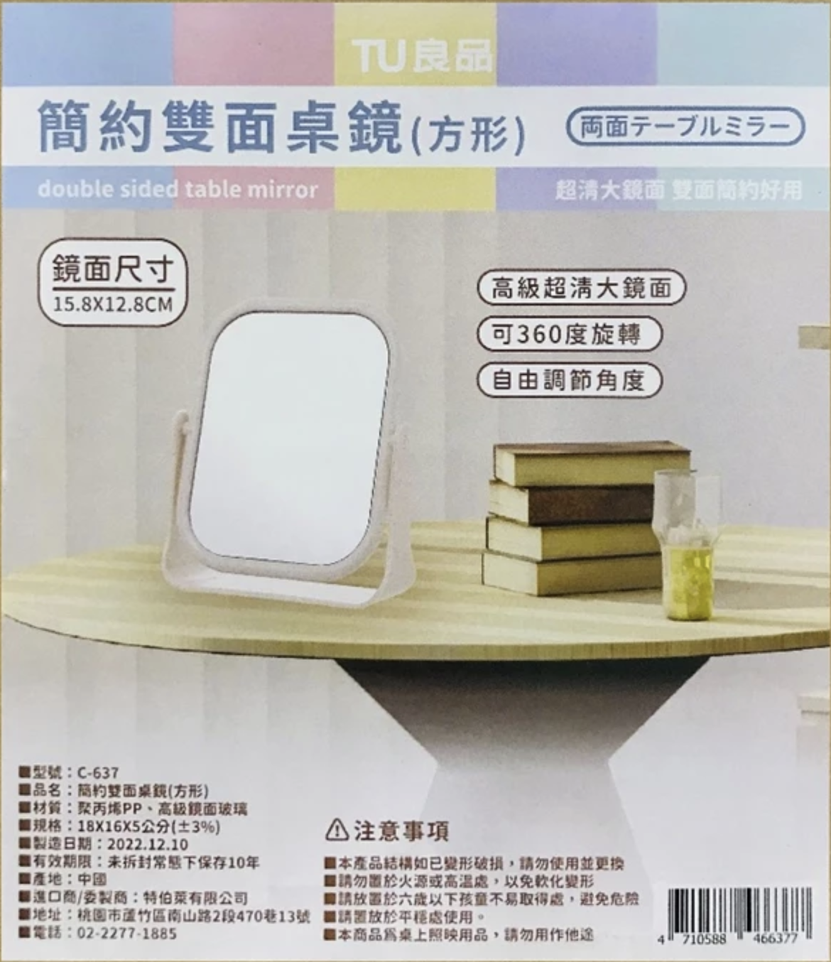 這款TU良品簡約雙面桌鏡,採用方形設計,簡約時尚,為您的桌面增添一份美感。雙面鏡設計,一面為標準鏡面,清晰呈現您的妝容細節,另一面則可根據需要調整角度,方便不同角度的觀察。鏡面採用高級玻璃材質,成像清晰不失真,讓您自信展現美麗。框架採用聚丙烯PP材質,輕巧耐用,不易變形。無論是化妝、整理髮型還是日常護理,這款桌鏡都是您的理想之選。