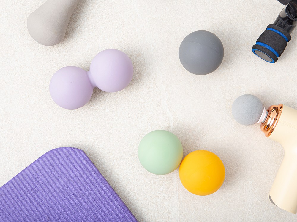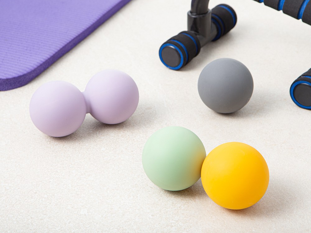 - 灰色矽膠按摩球觸感舒適,能有效針對身體各部位進行深層按摩,促進血液循環。