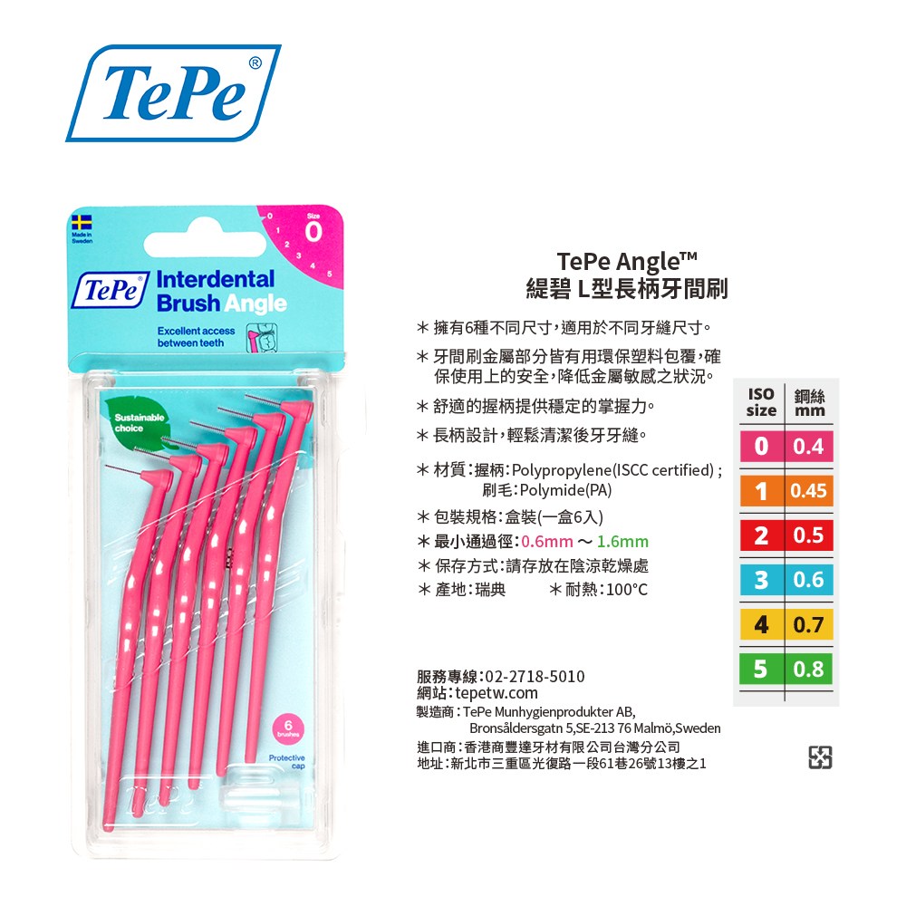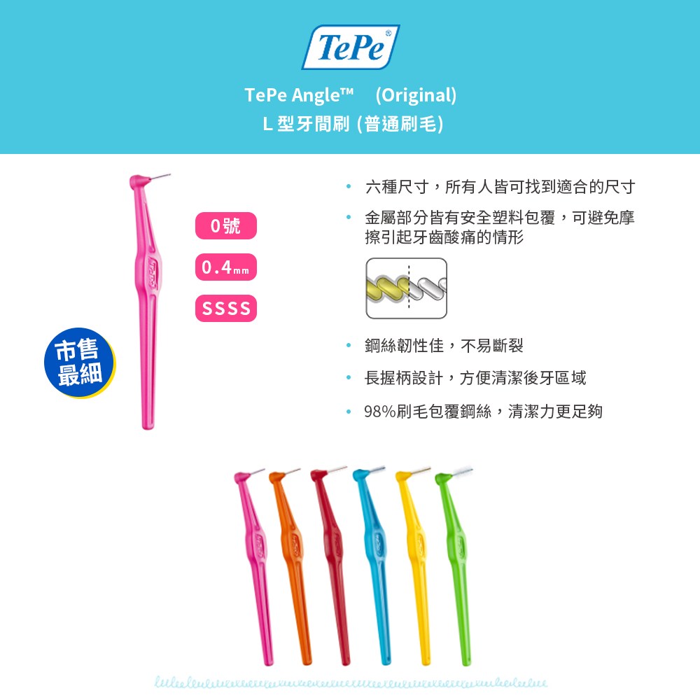 TePe 緹碧 L 型長柄牙間刷,為您輕鬆解決口腔清潔死角!這款 0 號 (0.4mm) SSSS 極細牙間刷,專為清潔牙縫設計,能有效去除牙菌斑和食物殘渣。L 型長柄設計,讓您輕鬆深入後牙縫,由內往外清潔,安全塑料覆蓋鋼絲,溫和不傷牙齦。刷毛覆蓋整個金屬絲,清潔力更佳,特別適合成人、矯正患者和植體護理者使用。每盒 6 入,讓您隨時保持口腔健康。
