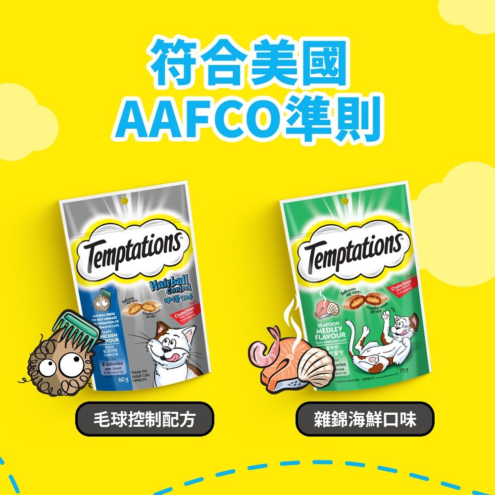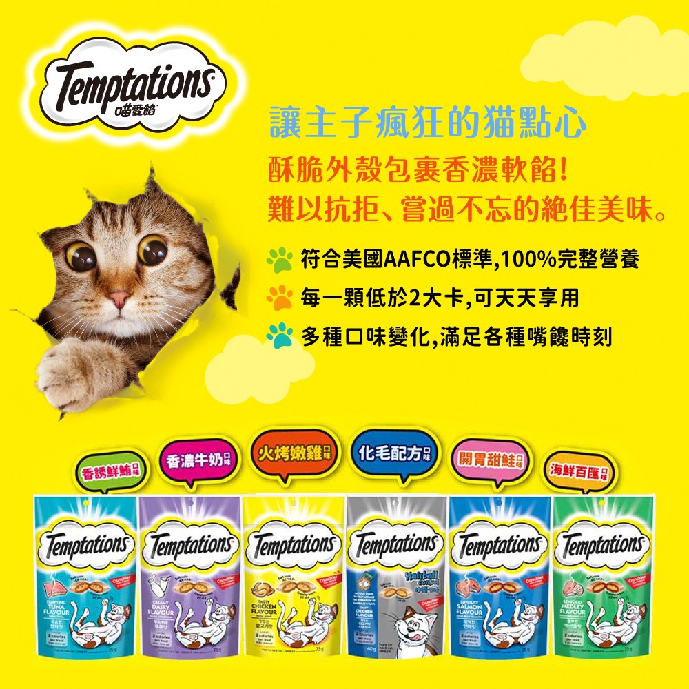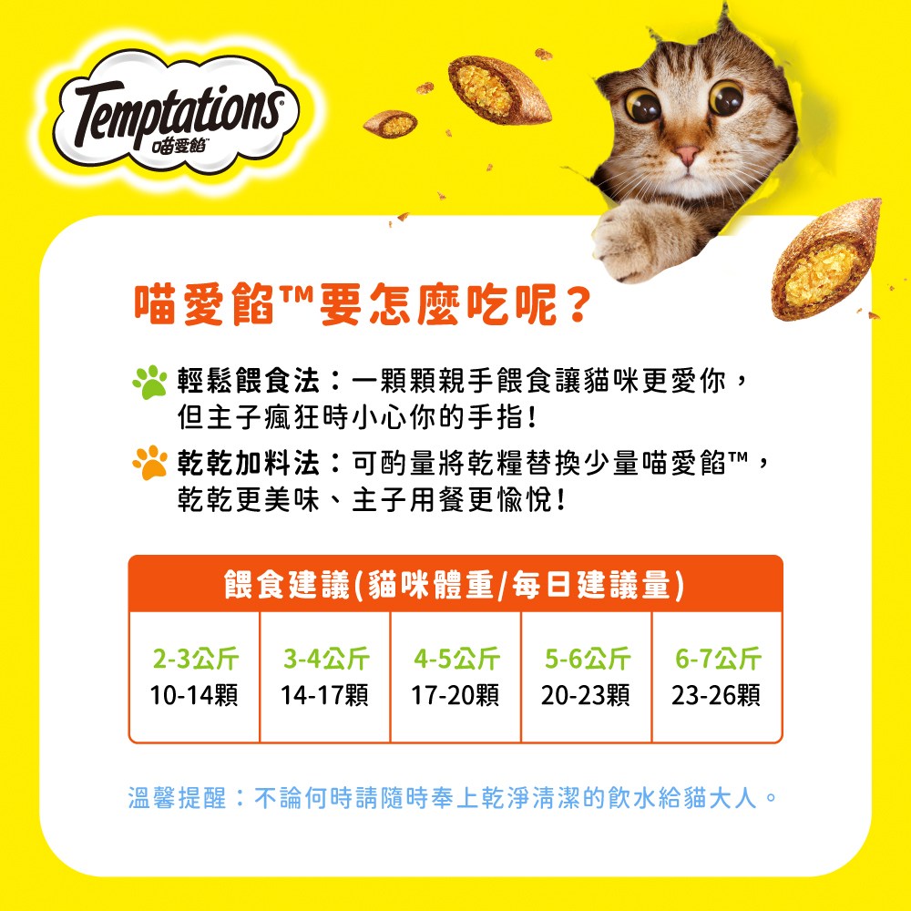 Temptations 喵愛餡化毛配方貓點心,是您呵護愛貓的不二之選。這款美味的貓點心不僅能滿足貓咪的味蕾,更添加了化毛配方,有助於減少毛球形成,讓貓咪更健康舒適。每箱包含12包60g的點心,方便儲存和餵食。酥脆的外殼包裹著柔軟的內餡,雙重口感讓貓咪愛不釋手。符合美國AAFCO標準,營養均衡,讓您安心給予愛貓美味又健康的零食。快來為您的愛貓準備這款美味又實用的Temptations 喵愛餡貓點心吧!