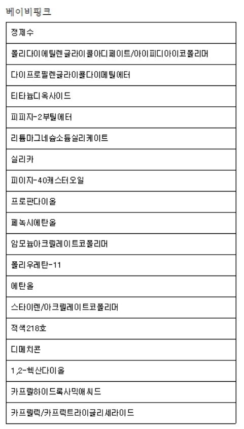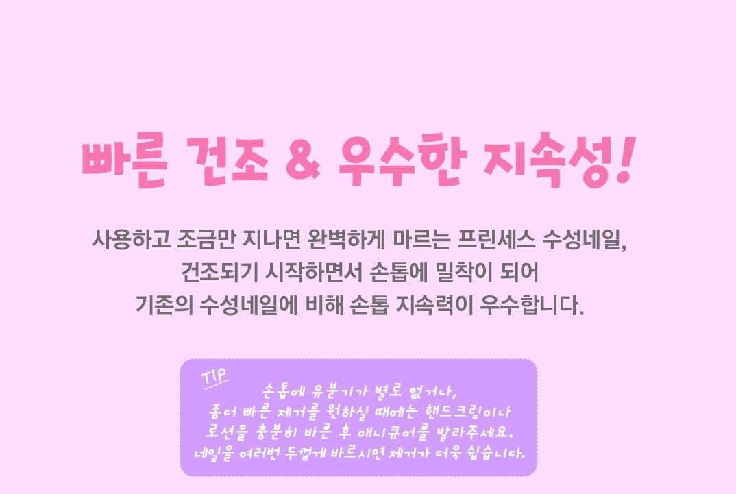 | 用法/保存方法 | 清潔指甲表面後,將其塗抹在指甲表面。 | 成分 | 粉色:純淨水、聚二甘醇己二酸酯/異二聚體、二丙二醇二甲醚、二氧化鈦、PPG-2丁基醚、矽酸鋰鎂鈉、二氧化矽、PEG-40蓖麻油、苯氧乙醇、丙烯酸銨共聚物、聚氨酯-11、乙醇、苯乙烯/丙烯酸酯共聚物,紅色218號,聚二甲基矽氧烷,1,2-己二醇,辛酰羥基酸,辛酸/癸酸甘油三酯/櫻桃粉:純淨水,聚二甘醇己二酸酯/異二聚體,二丙二醇二甲醚,PPG-2丁基醚,矽酸鋰鎂鈉、二氧化矽、PEG-40蓖麻油、二氧化鈦、丙二醇、苯氧乙醇、丙烯酸銨共聚物、聚氨酯-11、乙醇、苯乙烯/丙烯酸酯共聚物、紅218號、聚二甲基矽氧烷、1,2-己二醇、辛酸羥基酸,辛酸/癸酸甘油三酯/淡粉色:參見內容 |