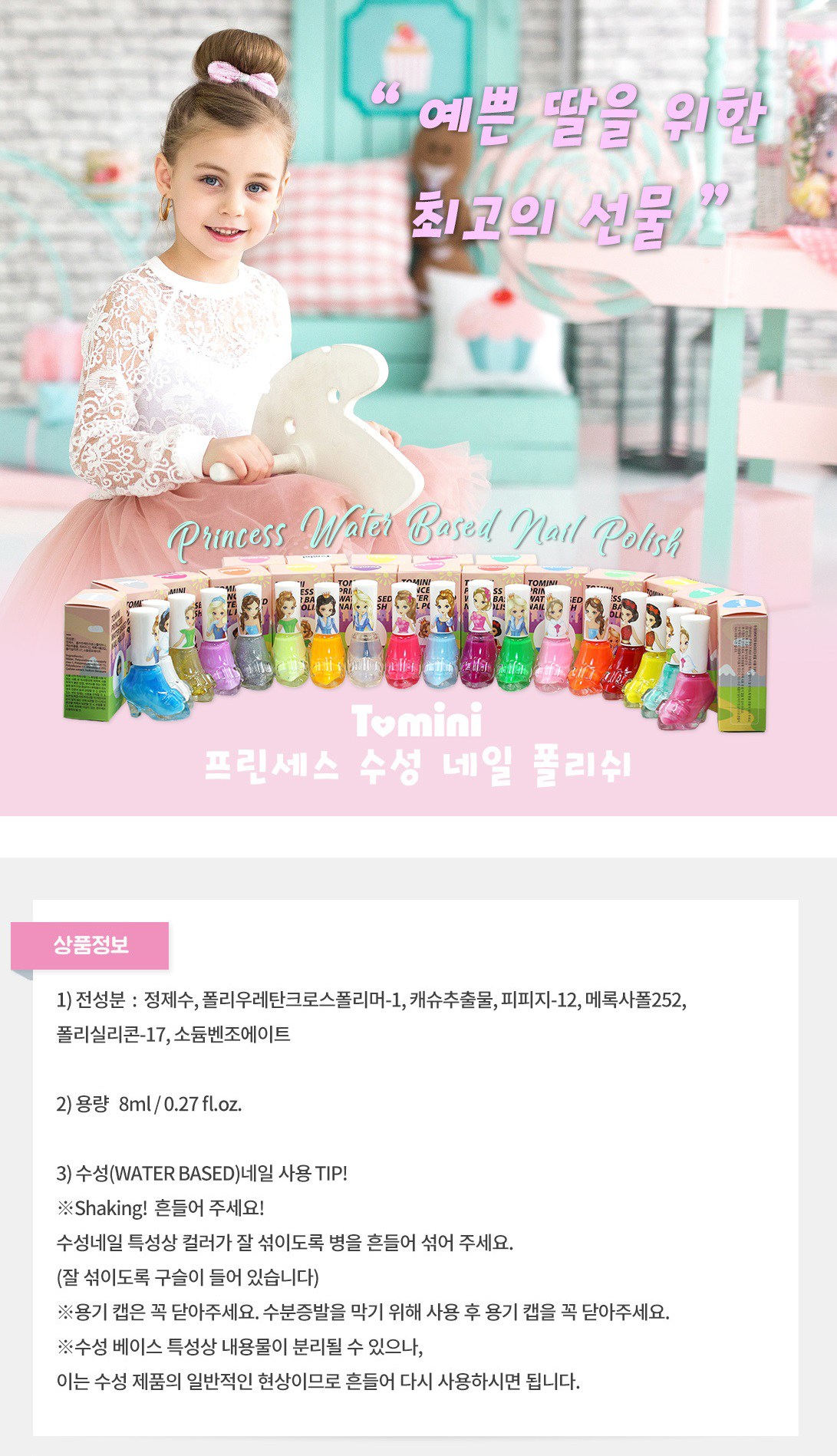 Tomini 孩童公主系列水性指甲油,專為孩子設計的安全指甲油。採用無毒水性配方,不含刺激性化學物質,讓孩子們可以使用。色彩鮮豔飽和,快乾持久,輕鬆打造可愛的指尖造型。無需卸甲水,輕輕一撕即可卸除,方便又安全。讓孩子們在玩樂中培養美感,展現獨特個性。
