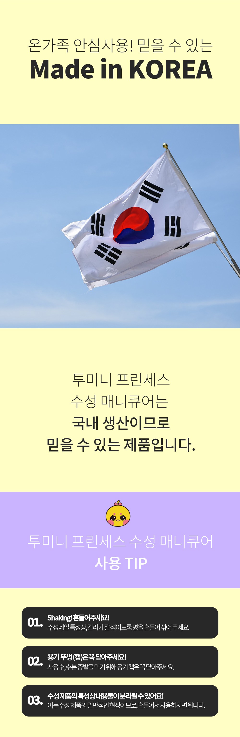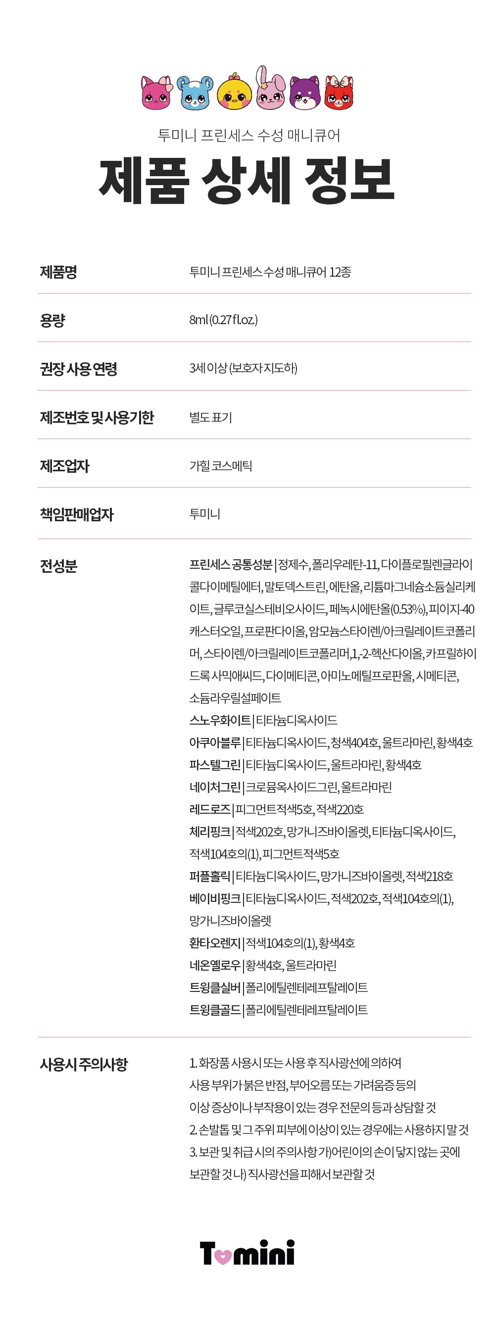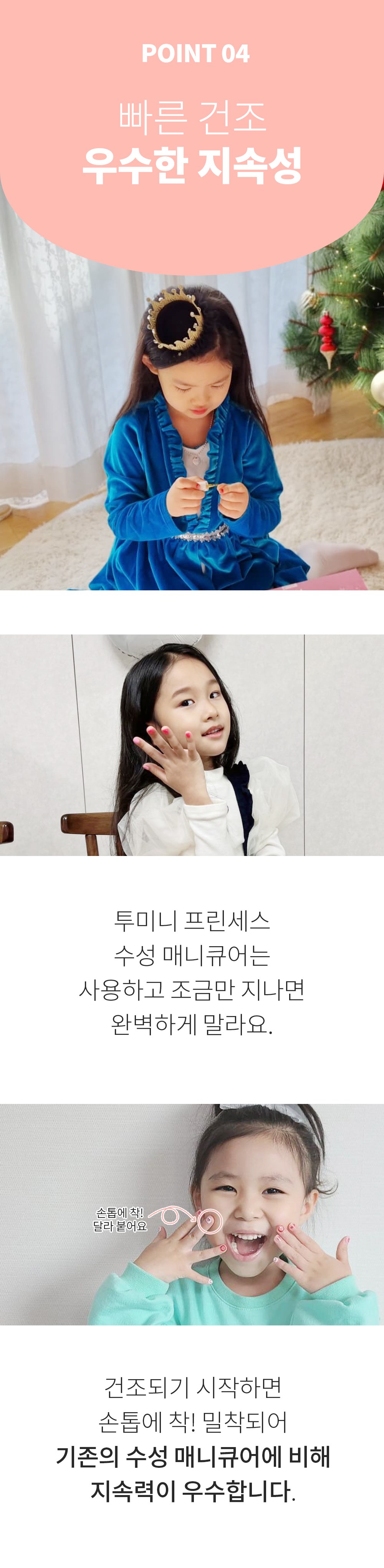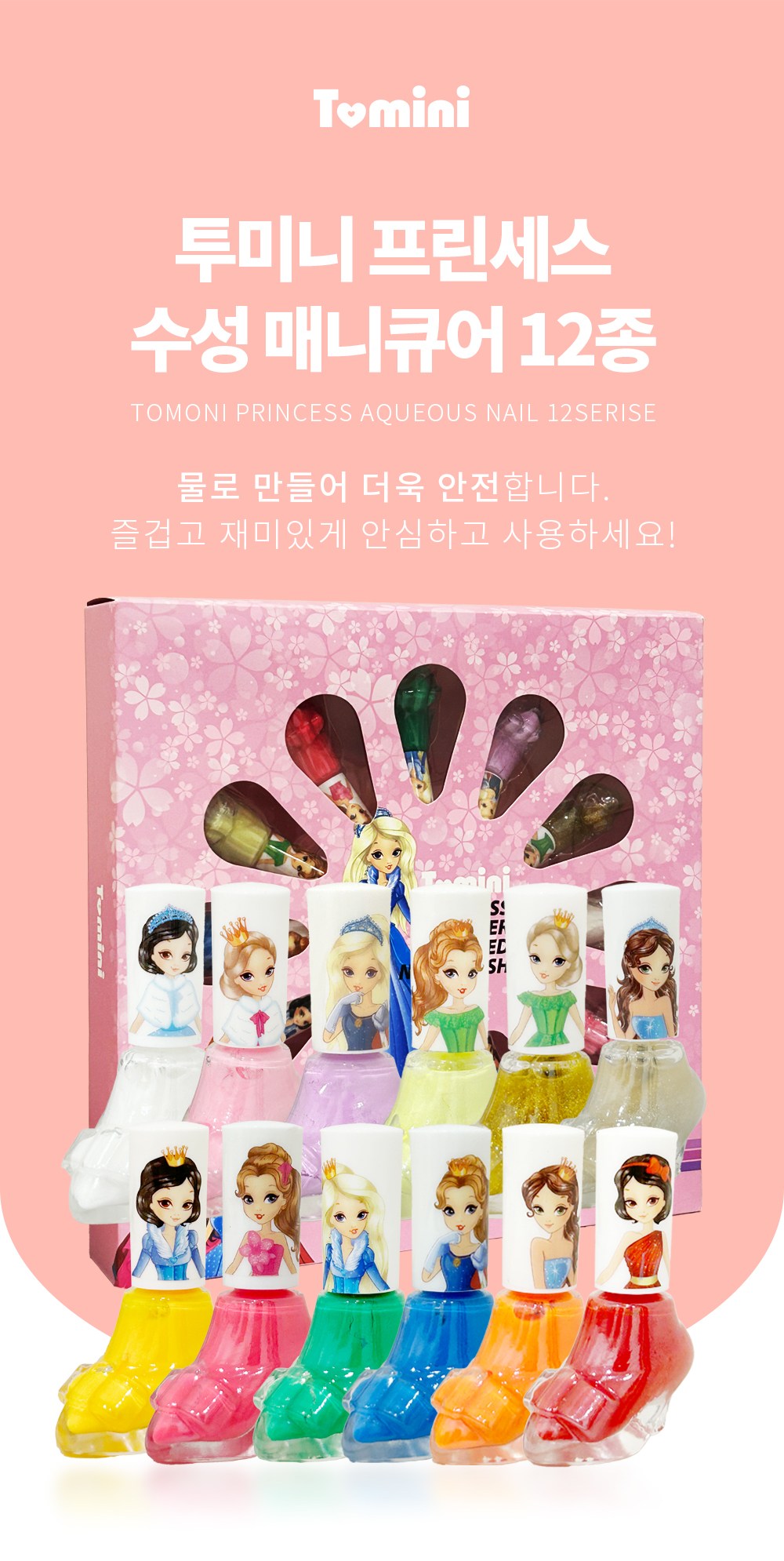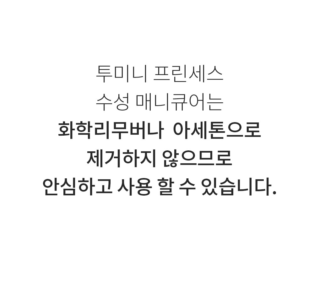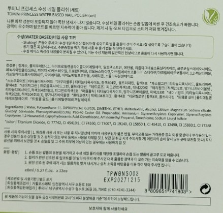Toomini Princess 水性指甲油專為呵護兒童嬌嫩指甲而設計,採用安全水性配方,不含刺激性化學物質,讓孩子們可以盡情享受美甲的樂趣。這款指甲油色彩豐富,顯色度高,能激發孩子們的創造力與想像力。獨特的撕拉式設計,卸除方便快捷,無需使用卸甲液,避免對指甲造成傷害。除了兒童,孕婦和所有年齡層的人都可以更安全地使用。讓孩子們在安全無憂的環境下,盡情展現個人風格。