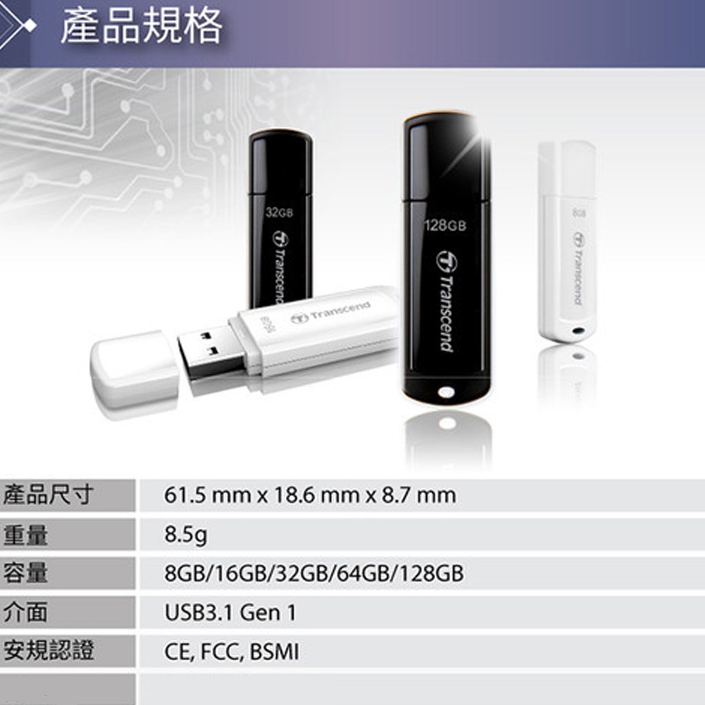 Transcend 創見 JetFlash 730 32G 隨身碟,白色外觀簡約時尚,是您儲存資料的理想選擇。採用USB 3.1 Gen 1高速傳輸介面,讓您能快速傳輸檔案,節省寶貴時間。32GB容量可儲存大量文件、照片、影片等資料,滿足您的日常需求。五年保固讓您安心使用,品質有保障。輕巧便攜的設計,方便您隨身攜帶,隨時隨地存取資料。