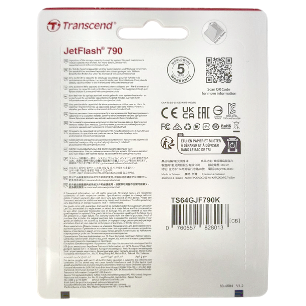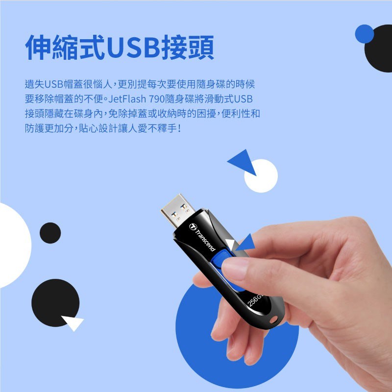 Transcend 創見 JetFlash 790 隨身碟,讓您輕鬆儲存和傳輸重要文件、照片、音樂和影片。這款隨身碟採用 USB 3.1 介面,提供高速傳輸速度,節省您的寶貴時間。64GB 的儲存容量,足以滿足日常工作和娛樂需求。伸縮式接頭設計,無需擔心帽蓋遺失,方便攜帶和使用。黑色外觀簡約時尚,適合各種場合。五年保固,讓您安心使用。