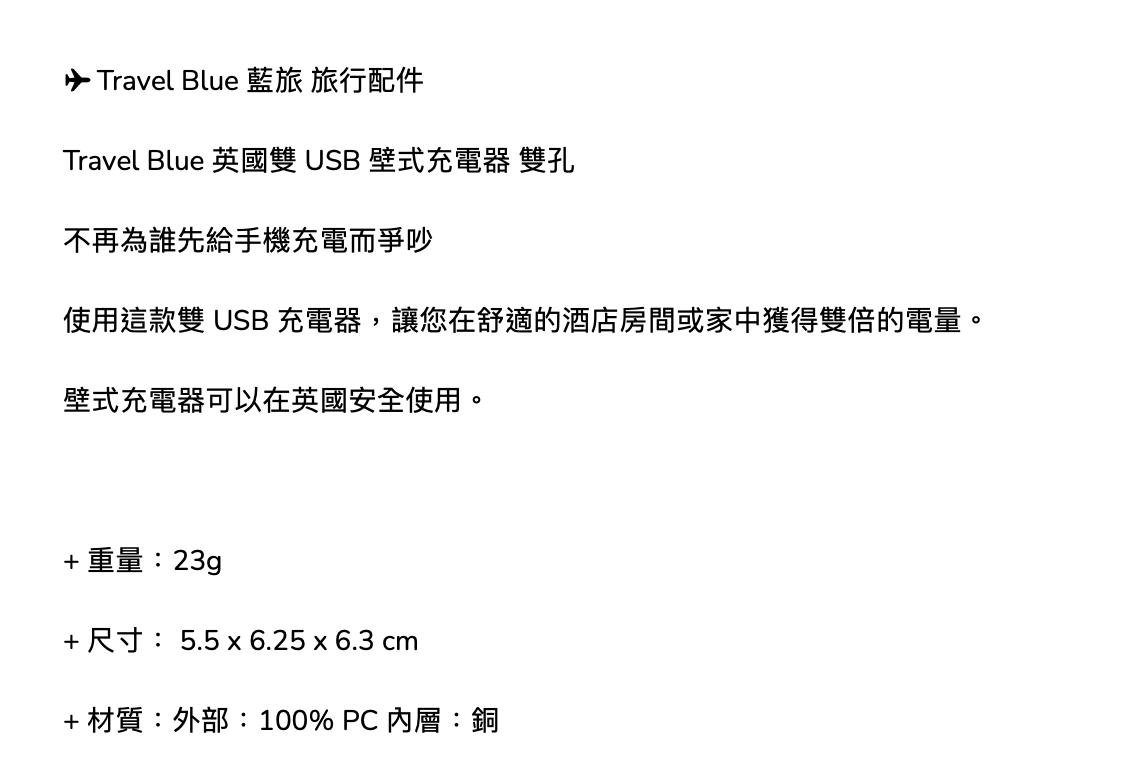 Travel Blue 旅行英國USB雙孔轉接頭充電器,是您出國旅行的必備良伴。這款輕巧的轉接頭僅重23克,尺寸為6.3 x 6.25 x 5.5公分,方便攜帶,不佔空間。它適用於所有標準英國13A插座,讓您在英國也能輕鬆使用自己的USB充電設備。雙USB插孔設計,可同時為兩部設備充電,節省您的時間。此外,Travel Blue品牌以其高品質和可靠性而聞名,讓您安心使用。無論是手機、平板還是其他USB設備,這款轉接頭都能滿足您的充電需求,讓您的旅途更加便捷。