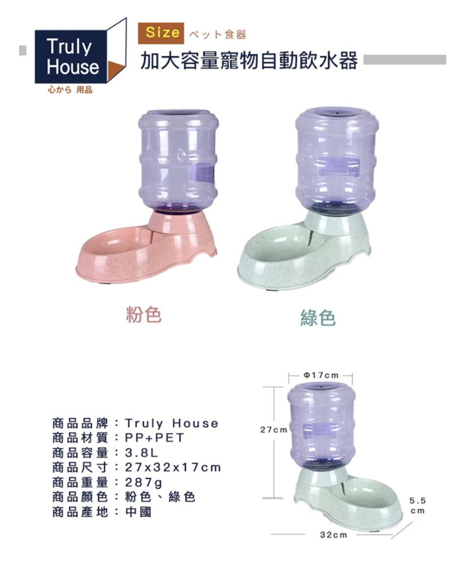 Truly House 寵物自動飲水器,讓您的愛寵隨時都能享用乾淨的水源。這款3.8L大容量飲水器,採用重力自動補水設計,無需頻繁加水,省時省力。綠色外觀清新自然,讓您安心使用。自動供水功能確保寵物隨時有水喝,特別適合忙碌的寵物主人。簡約設計易於清潔,為您的愛寵提供健康飲水體驗。