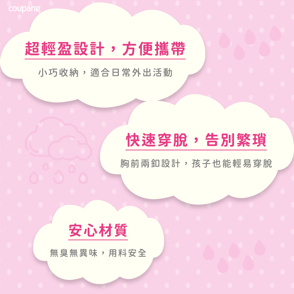 - 一體成型設計,方便快速穿脫,節省時間,讓孩子輕鬆應對下雨天。