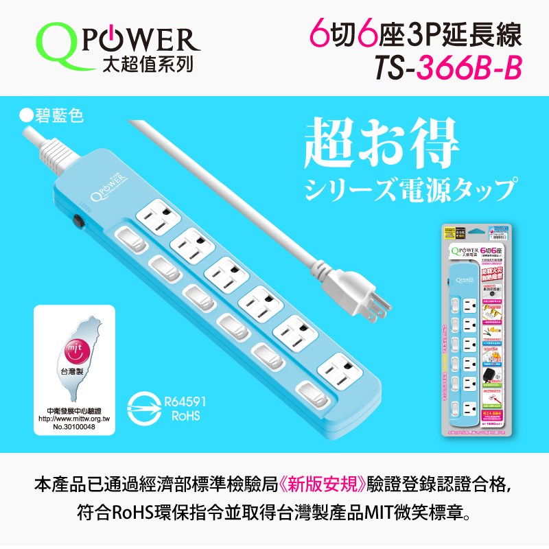Tyson 太順電業 QPOWER 太超值 3孔6開6插 延長線插座, TS-366B, 1.2M/4R, 碧藍色, 1個