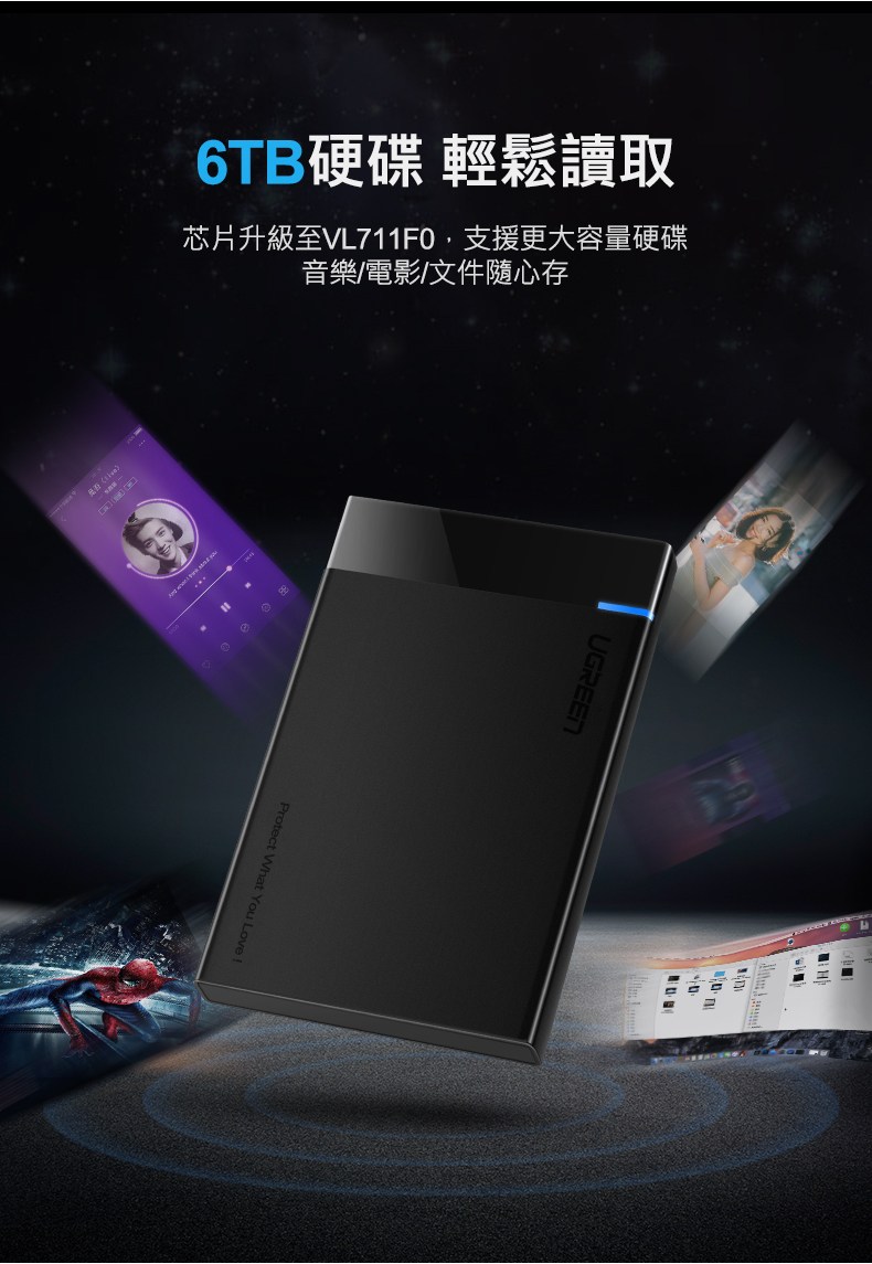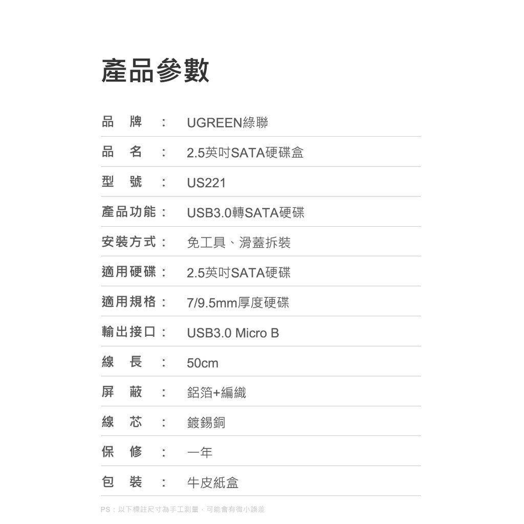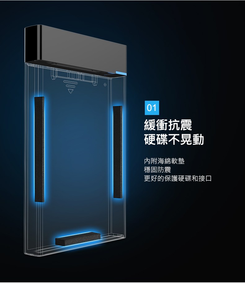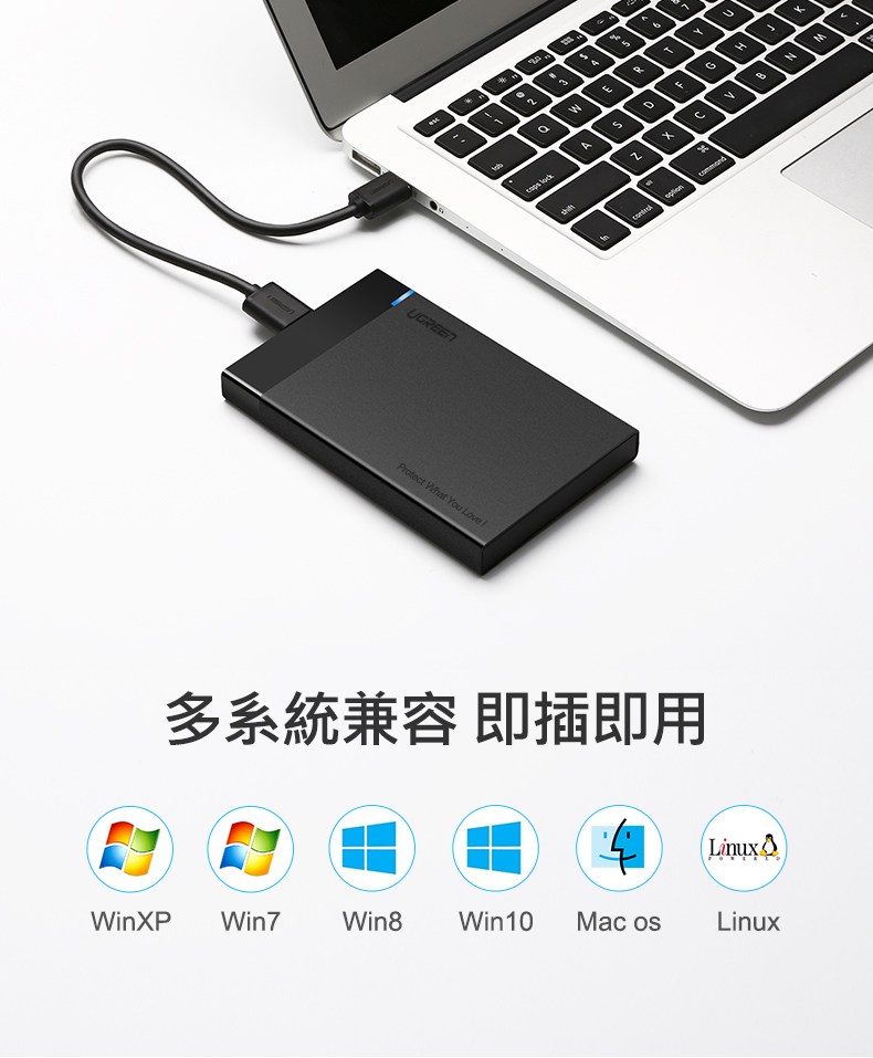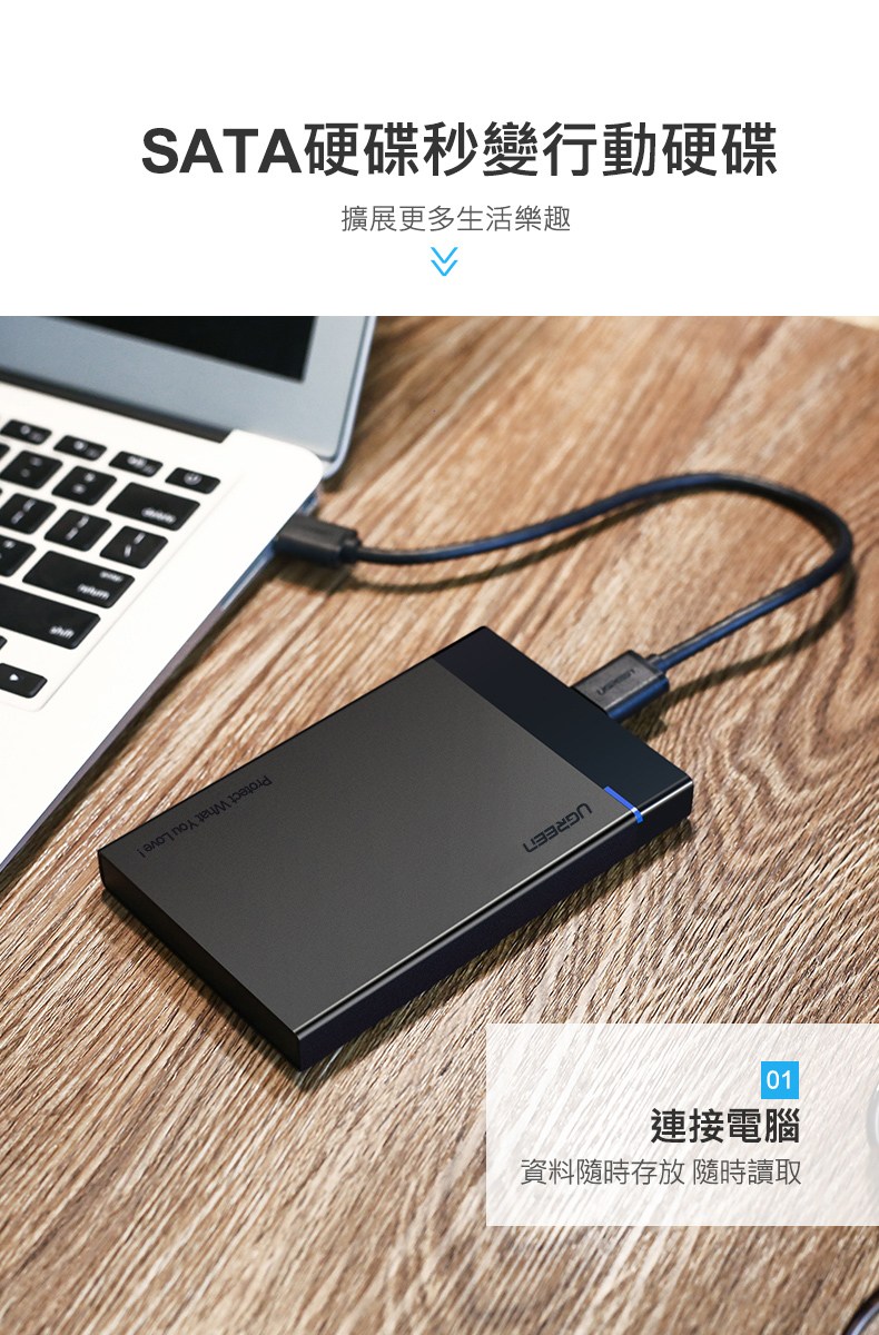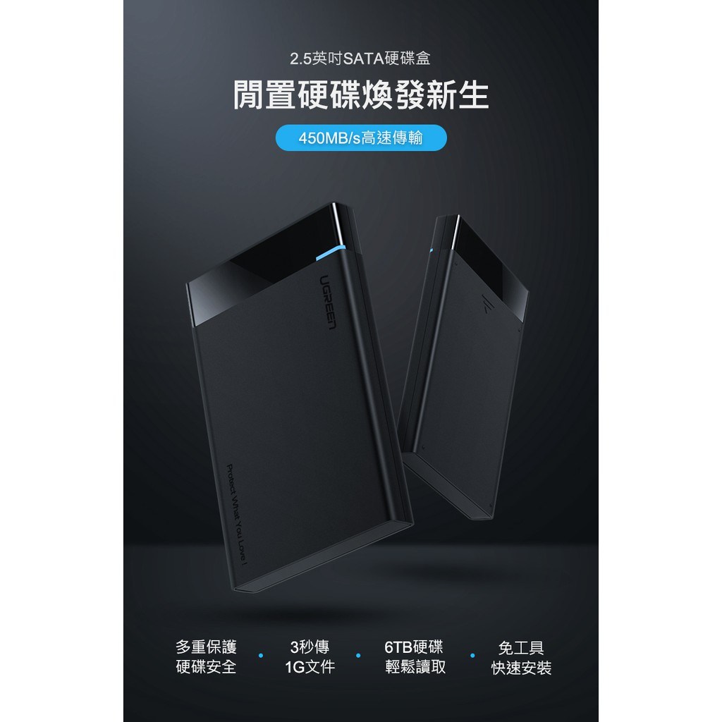 綠聯2.5吋USB3.0隨身硬碟外接盒,讓閒置的2.5吋SATA硬碟重獲新生,變身為高速行動硬碟。採用USB 3.0傳輸介面,支援UASP加速協議,傳輸速度高達450MB/s,大幅縮短檔案傳輸時間。免工具安裝設計,滑蓋拆裝,方便快捷。外殼採用PC+ABS材質,堅固耐磨,有效保護硬碟免受意外跌落損壞。內附海綿軟墊,穩固防震,全方位保護硬碟和介面。