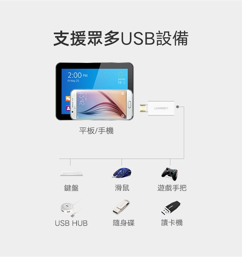 - OTG功能擴展,讓您的手機或平板電腦直接連接USB設備,如隨身碟。