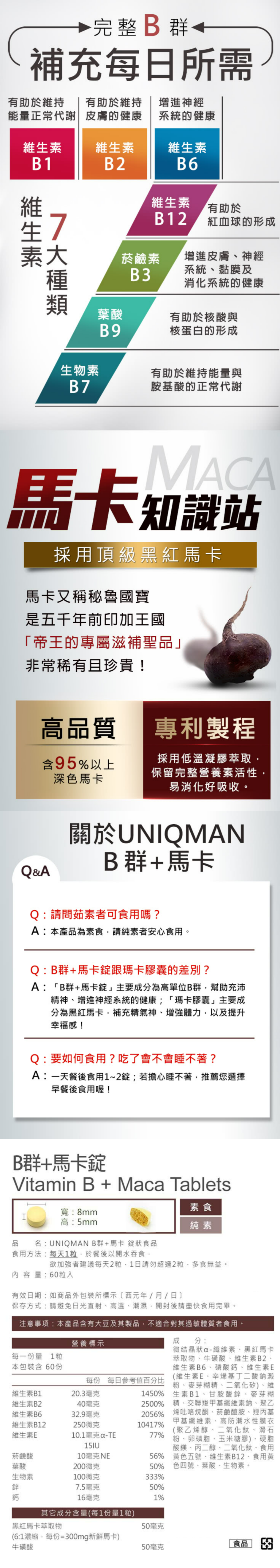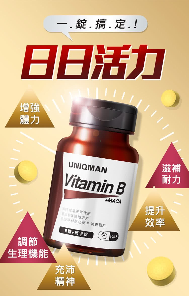 UNIQMAN B群+馬卡錠,專為男性設計的活力補給品。每錠結合完整B群與頂級黑紅馬卡,能有效維持能量正常代謝,告別疲勞感,同時補充戰鬥力。B群有助於增進神經系統健康,馬卡則能滋補強身,提升幸福感。本產品為丸片/膠囊類型,每罐60錠,方便每日補充,是您維持健康、提升活力的最佳選擇。