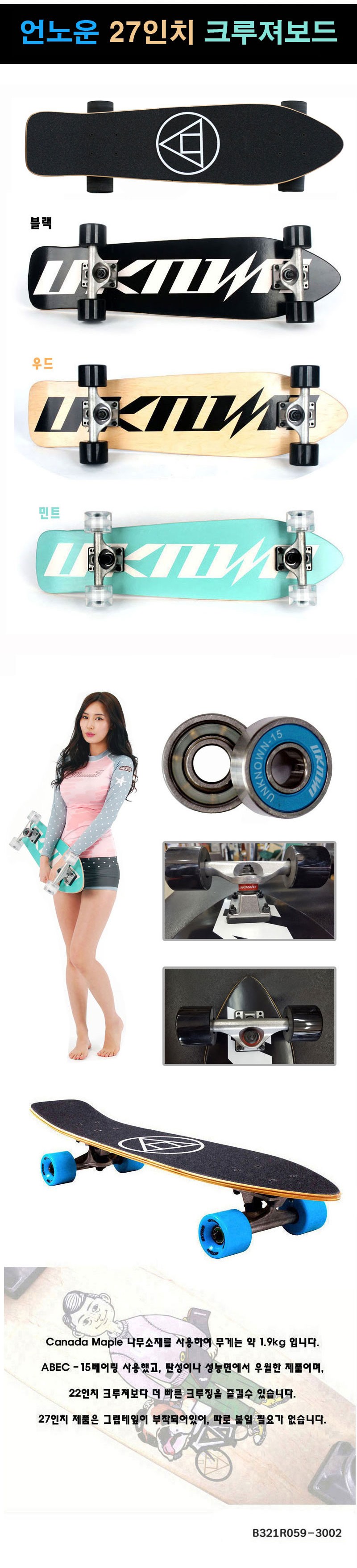 Unknown 27吋巡洋艦板採用高品質加拿大楓木製成,堅固耐用,提供穩定的滑行體驗。配備ABEC-15軸承,彈性及性能表現優異,讓您享受更快速、更流暢的巡航體驗。27吋的尺寸設計,適合各種程度的滑板愛好者。此款巡洋艦板已預先貼好砂紙,省去自行黏貼的麻煩,開箱即可立即使用。薄荷色外觀清新時尚,讓您在街頭滑行時展現個人風格。