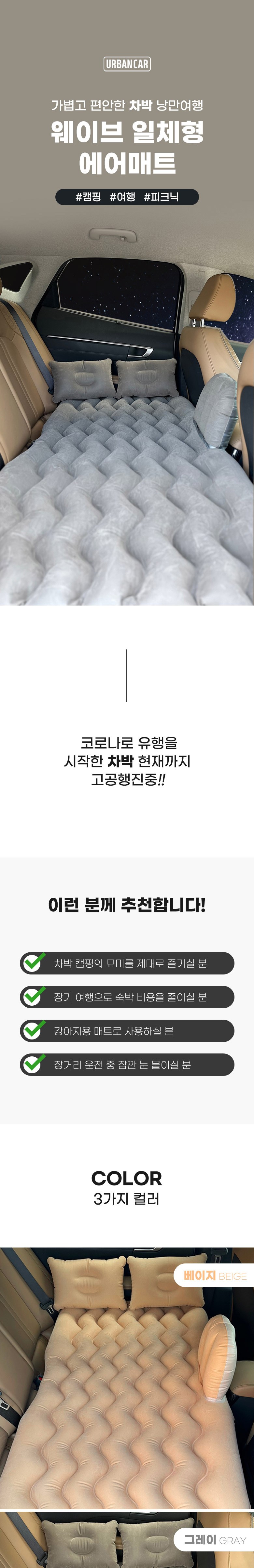 這款URBAN CAR車用波浪一體式氣墊,是您車宿露營的最佳選擇。採用點煙器氣泵,充氣方便快速,讓您隨時隨地都能擁有舒適的睡眠空間。一體式安全護欄設計,有效防止墜落,讓您在旅途中更加安心。柔軟的天鵝絨材質搭配波浪形壓花,提供絕佳的舒適度和支撐性。附贈兩個柔軟的氣墊枕頭和便攜收納袋,讓您的旅途更加輕鬆愉快。
