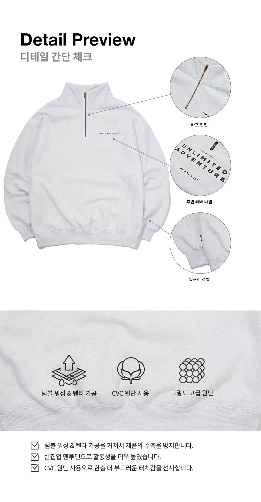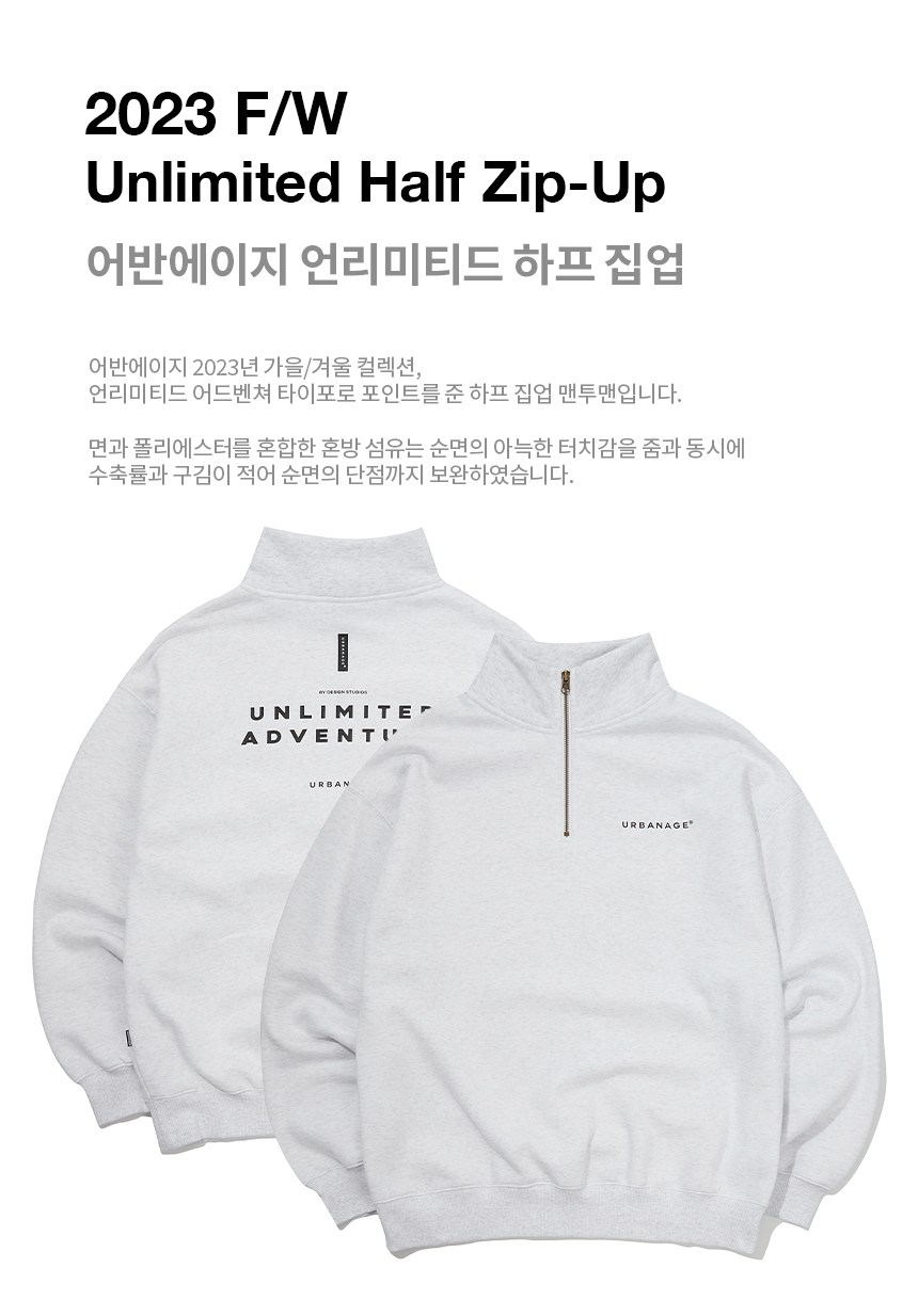 Urbanage Unlimited半拉鍊大學T,是2023年秋/冬系列的亮點單品。採用棉與聚酯纖維混紡的CVC布料,兼具純棉的舒適觸感和聚酯纖維的耐用性,改善了純棉易皺和縮水的缺點。寬鬆版型設計,提供舒適的穿著體驗。半拉鍊設計增添了穿搭的靈活性,正面和背面均有橡膠印花,細節感十足。經過滾筒水洗和預縮加工,有效防止衣物縮水變形。