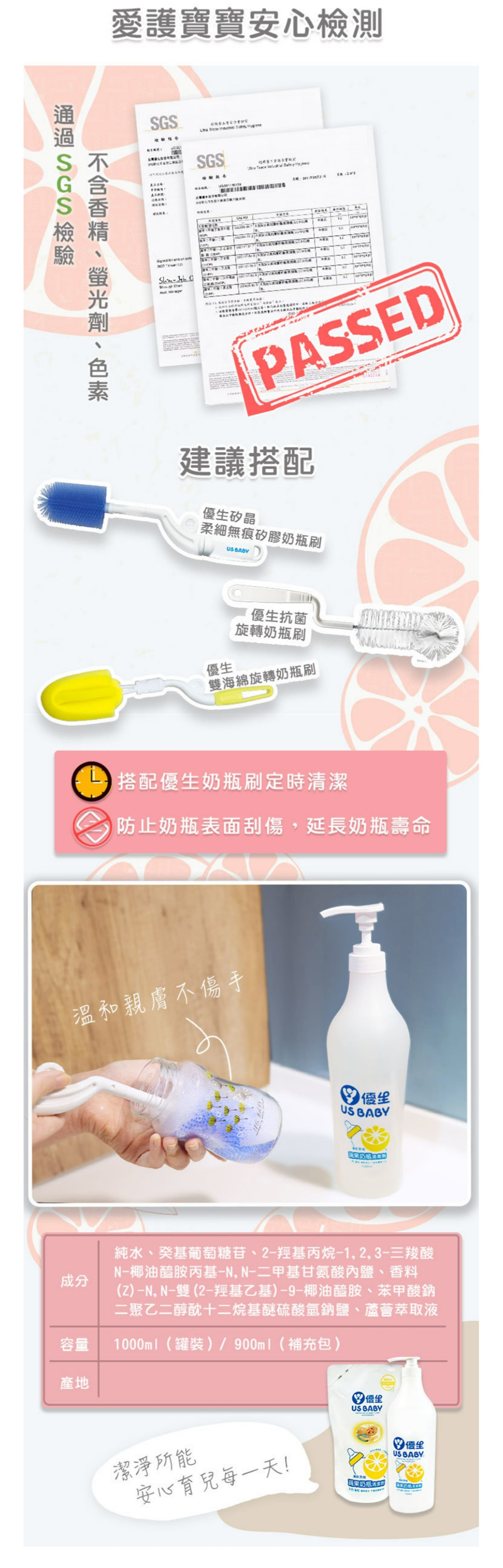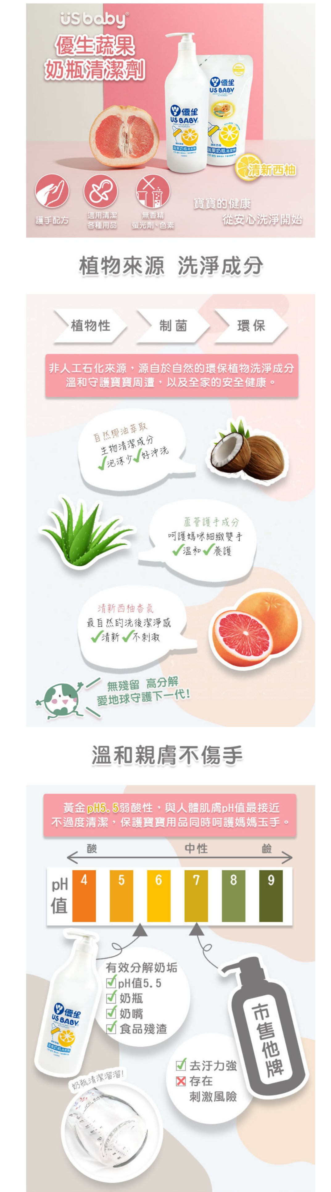 - 清新西柚香味,洗後奶瓶散發淡淡果香,讓寶寶更喜歡,媽媽也心情愉悅。
