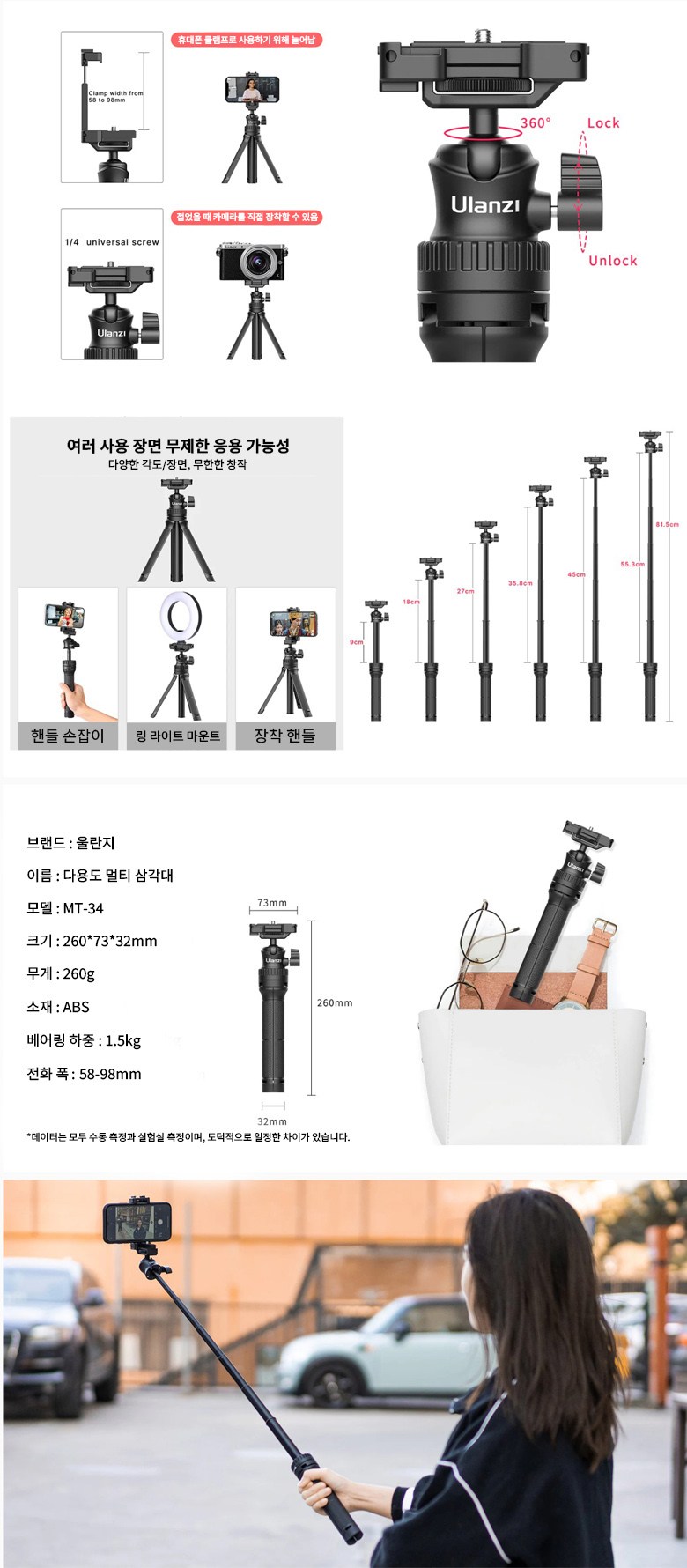 Ulanzi MT-34多功能三腳架是一款輕巧便攜的手機攝影配件,採用ABS材質,堅固耐用。它不僅可以作為三腳架使用,提供穩定的拍攝平台,還可以伸縮調節高度,滿足不同場景的需求。手機夾具適用於寬度在58-98mm之間的手機,確保設備安全。無論是自拍、錄影還是直播,MT-34都能為您提供便利。其輕巧的設計讓您隨時隨地都能輕鬆攜帶,捕捉生活中的美好瞬間。