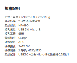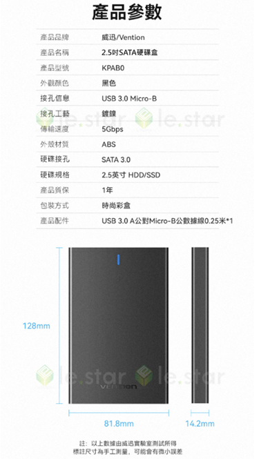 VENTION威迅KPA系列2.5吋SATA硬碟盒,讓您輕鬆擴充儲存空間。採用USB3.0 Micro-B介面,傳輸速度快,資料備份更有效率。12.8 x 8.18cm的輕巧尺寸,方便攜帶,隨時隨地擴充您的筆記型電腦或桌上型電腦的儲存容量。免工具安裝設計,讓您輕鬆組裝2.5吋HDD/SSD,即使是3C新手也能快速上手。堅固耐用的外殼,有效保護您的硬碟,確保資料安全無虞。藍色LED指示燈,隨時顯示硬碟盒的運作狀態。