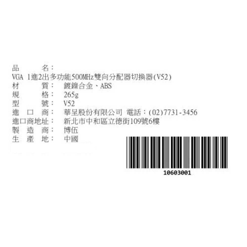 VGA 1進2出多功能500MHz雙向分配器切換器, V52, 1個