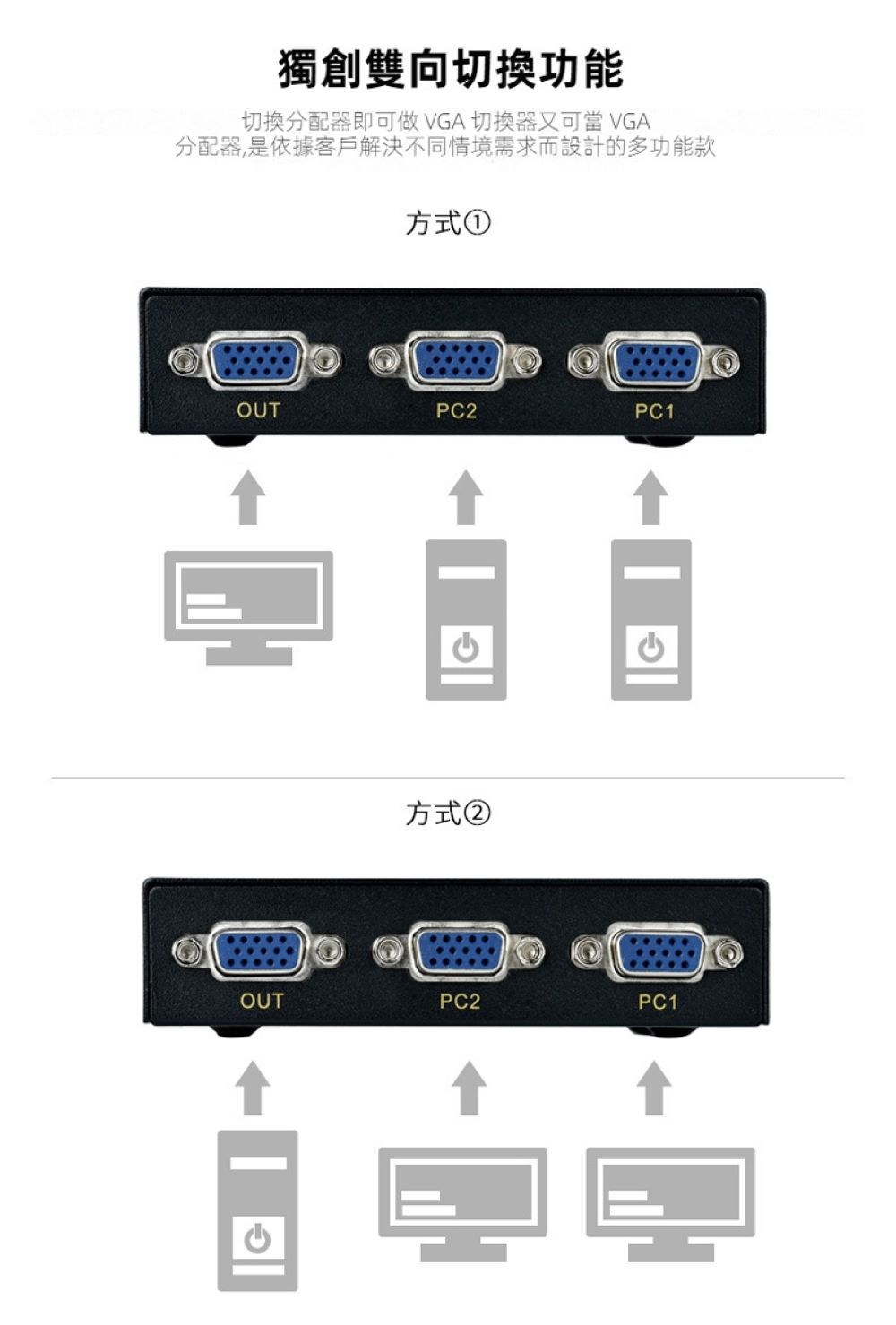 - 獨創雙向切換設計,可作為VGA切換器或分配器,靈活應對各種情境需求。