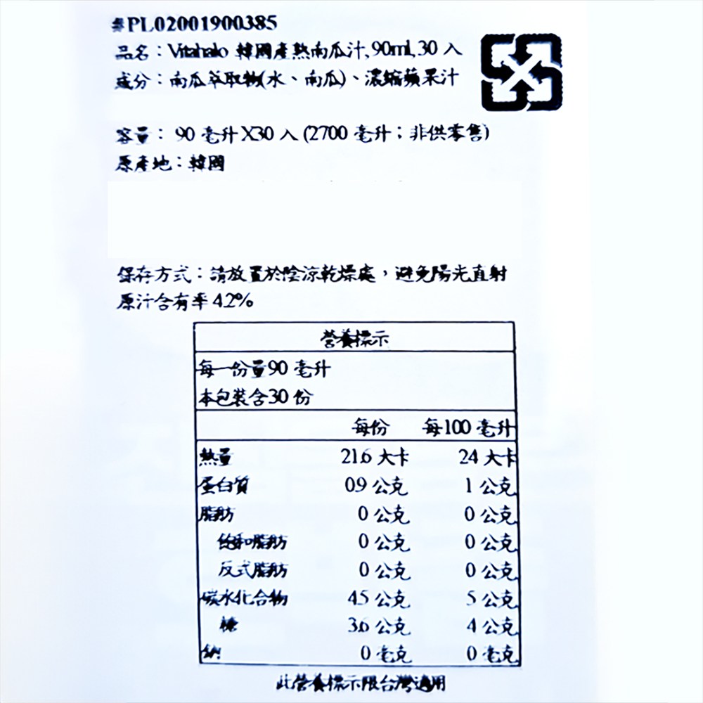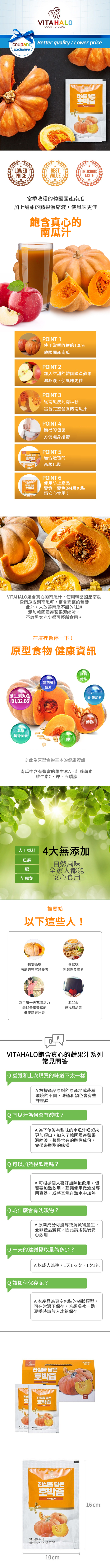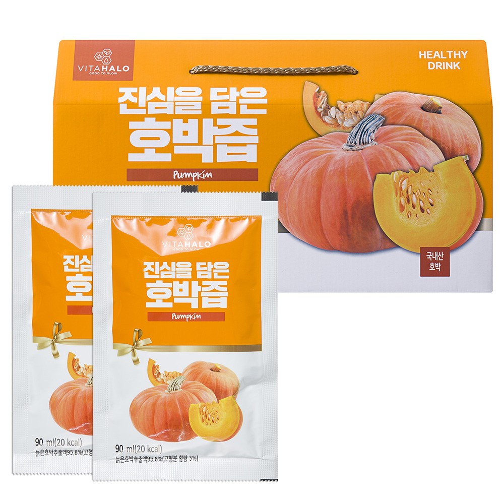 Vitahalo 韓國產熟南瓜汁,嚴選韓國優質熟南瓜,以傳統工藝精心熬製而成,每一口都充滿濃郁的南瓜香甜。獨立包裝,方便攜帶,隨時隨地享受健康美味。富含膳食纖維和多種維生素,有助於促進腸道蠕動,維持消化機能。適合各年齡層人士飲用,特別是注重養生、追求健康生活方式的您。每日一包,輕鬆補充營養,讓您由內而外散發健康光彩。