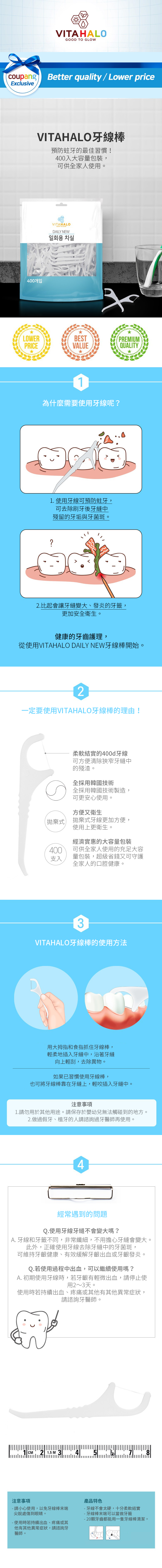 VITAHALO牙線棒採用柔軟且堅韌的牙線,能輕鬆深入牙縫,有效清除食物殘渣和牙菌斑,預防蛀牙。牙線棒末端可作為牙籤使用,方便剔除較大的食物殘渣,提供雙重清潔。獨立包裝設計,衛生又方便攜帶,讓您隨時隨地保持口腔清新。全家適用的大容量包裝,經濟實惠,是您維持口腔健康的理想選擇。韓國製造,品質安心。