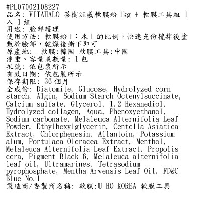 VITAHALO 茶樹涼感軟膜粉套裝,為您帶來專業級的面部護理體驗,同時帶來清涼舒適感。套裝包含1公斤軟膜粉及全套軟膜工具,方便您在家輕鬆調配使用。軟膜能深層清潔毛孔,去除多餘油脂,讓肌膚回復潔淨清爽。使用後,肌膚倍感水潤光滑,散發健康光彩。適合各種膚質,特別推薦給需要舒緩鎮靜的肌膚使用。