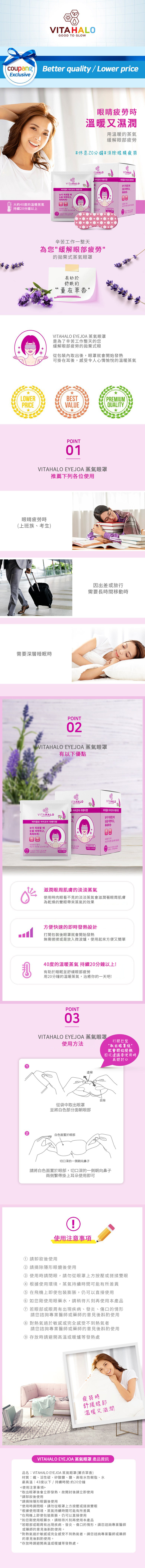 VITAHALO 蒸氣眼罩採用方便快速的即時發熱設計,打開包裝即可使用,無需微波或搓揉。約40°C的溫暖蒸氣,能溫柔呵護您的雙眼,讓您在20分鐘內享受水潤舒適的感受。淡淡的薰衣草香氛,讓您在忙碌的一天後,享受片刻的寧靜與放鬆。無論是上班族、學生,或是需要長時間旅行的人,都能隨時隨地享受這款眼罩帶來的舒適體驗。