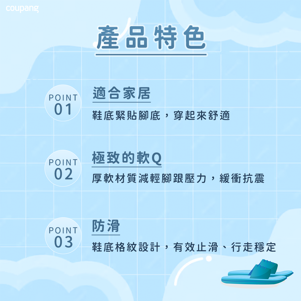 - 採用厚軟材質,有效減輕腳跟壓力,讓您在家中也能輕鬆自在地走動,告別疲勞。