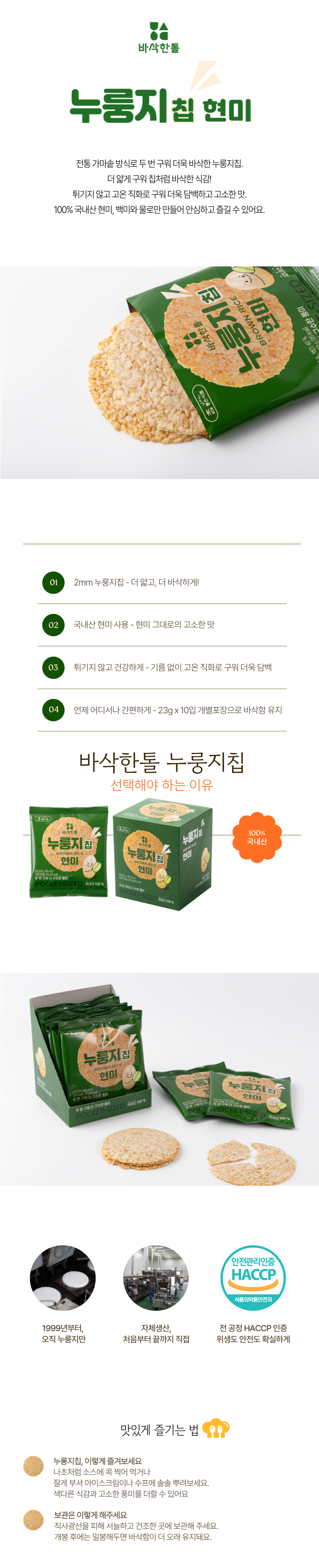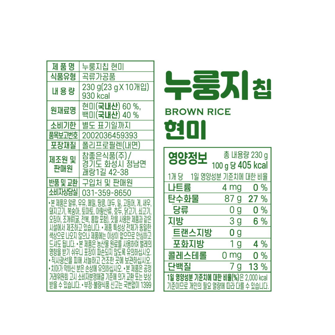 - 酥脆鍋巴片使用韓國產糙米和白米製成,口感豐富,讓您隨時享受傳統美味。