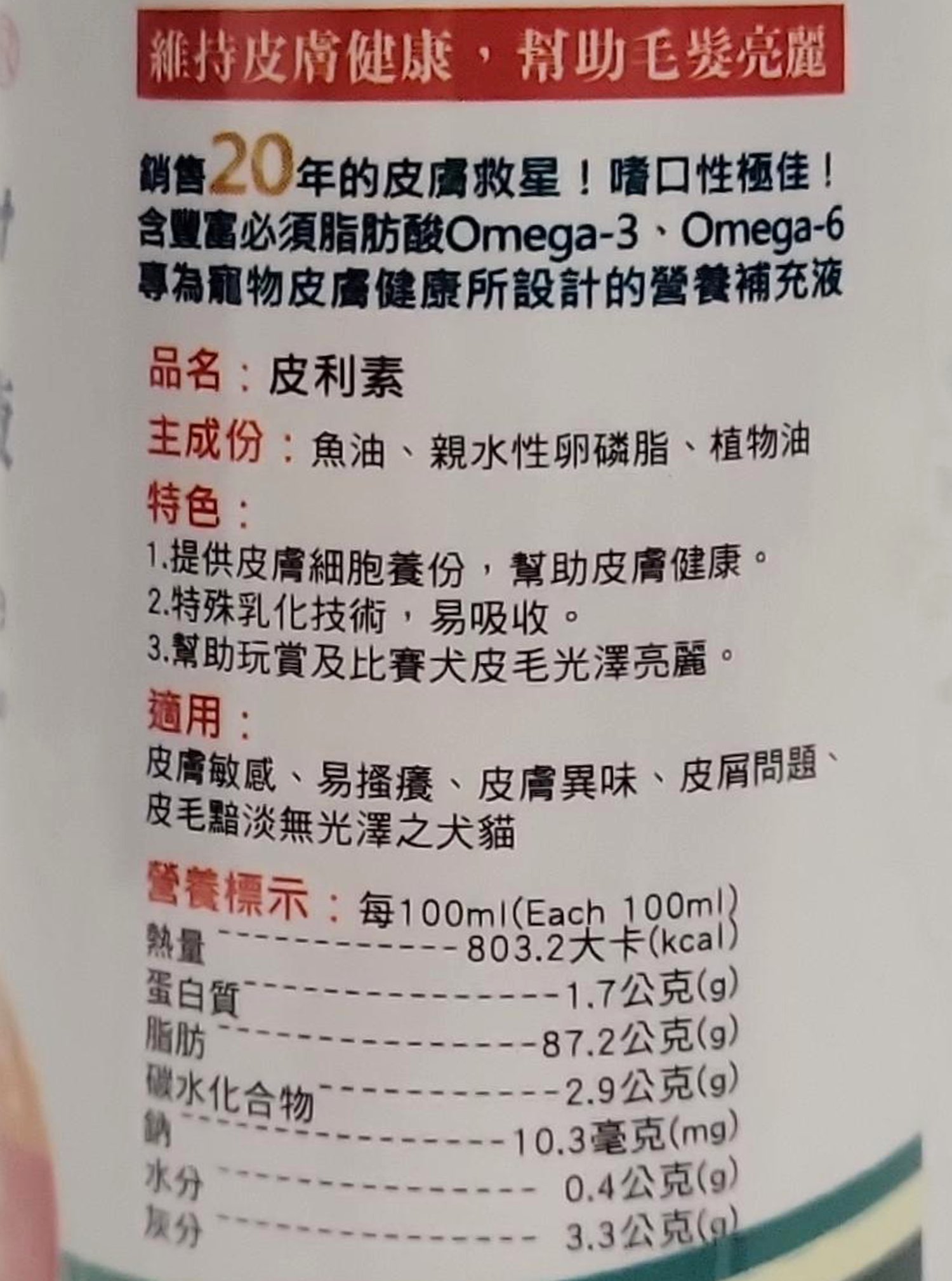 - - 寵物皮膚營養補充液,讓毛孩輕鬆擁有健康亮麗的毛髮,展現活力。