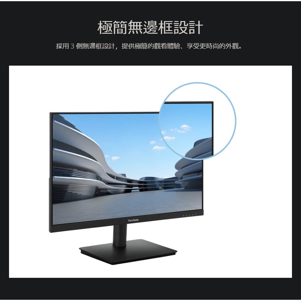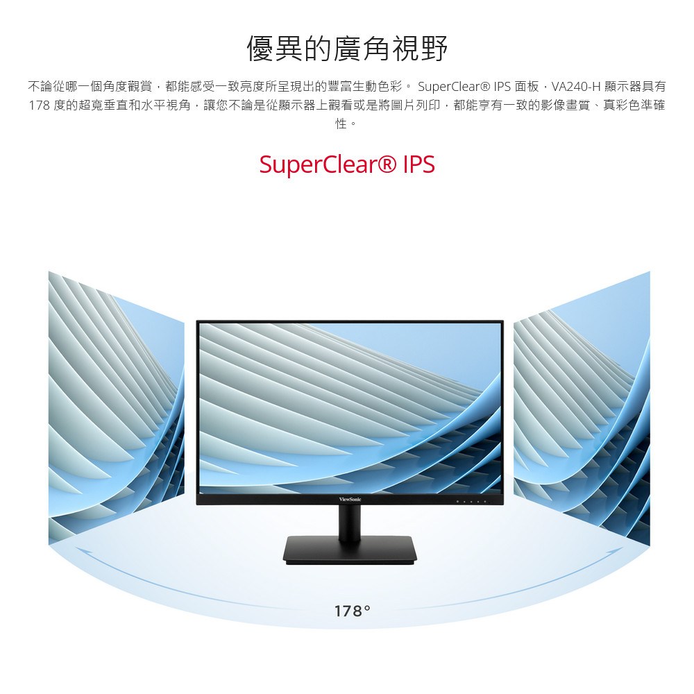 ViewSonic VA240-H 窄邊框螢幕,提供24吋Full HD (1920x1080) 高解析度,讓您享受清晰細膩的視覺體驗。100Hz 畫面更新率和 1ms 反應時間,確保快速移動的畫面也能流暢呈現,減少殘影,非常適合遊戲和影音娛樂。SuperClear® IPS 技術提供 178 度的廣視角,無論從哪個角度觀看,色彩都鮮明一致。此外,VA240-H 具備 HDMI 和 VGA 連接埠,方便連接各種裝置,內建的 Eye-Care 護眼技術,能有效降低藍光和閃爍,保護您的眼睛,長時間使用也不易疲勞。窄邊框設計不僅時尚美觀,更能提升您的視覺沉浸感,讓您專注於螢幕內容,享受更佳的視覺體驗。