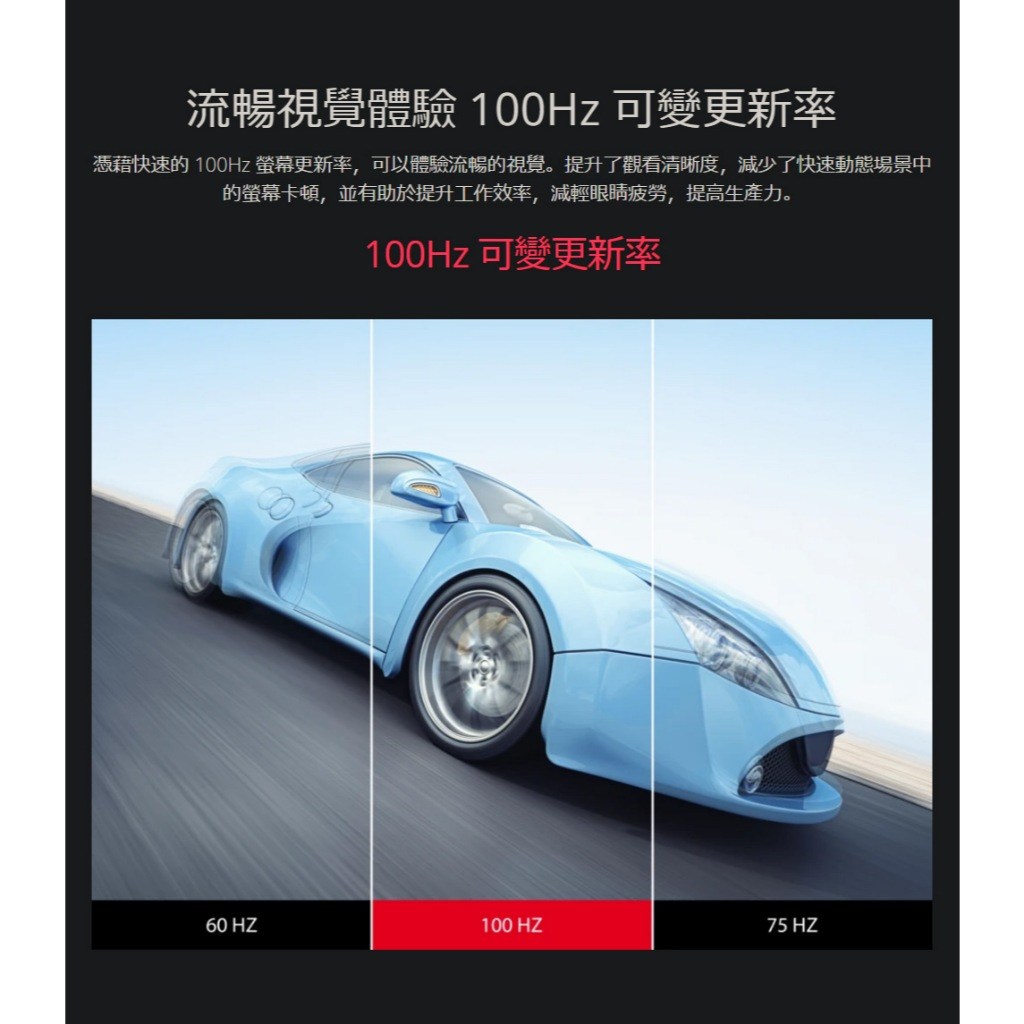 - 100Hz 刷新率,畫面流暢無殘影,享受更順暢的遊戲體驗與視覺效果。