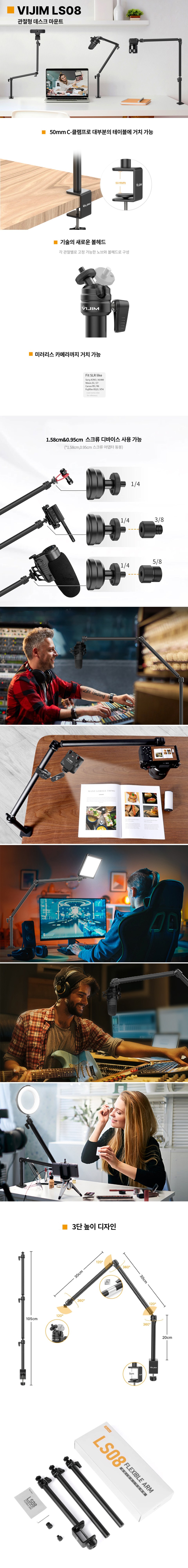 VIJIM LS08桌面用關節式支架是一款多功能支架,適用於單眼、微單眼相機、麥克風和補光燈等多種設備。它採用堅固耐用的材質,確保設備的穩定性。此支架具有可調節的關節設計,讓您可以輕鬆調整拍攝角度,滿足不同的拍攝需求。配備50mm C型夾,可固定在厚度達50mm的桌面上,安裝簡便。無論是桌面拍攝還是直播,VIJIM LS08都能為您提供穩定的支撐。