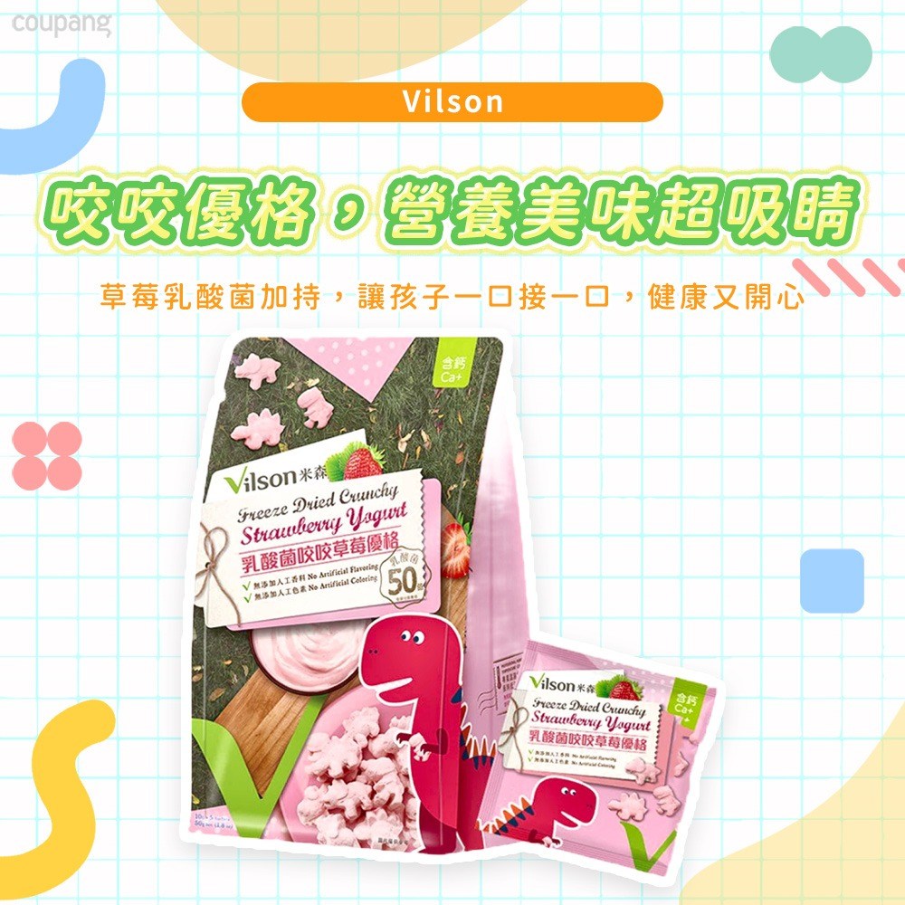Vilson米森乳酸菌咬咬優格,是一款專為寶寶設計的健康零食。嚴選優質原料,製成酥脆的冷凍乾燥優格塊,口感豐富。特別添加乳酸菌,幫助寶寶維持消化道機能,促進腸道健康。草莓口味酸甜適中,搭配可愛的恐龍造型,讓寶寶在享受美味的同時,也能獲得滿滿的營養與樂趣。無添加人工香料及色素,讓寶寶吃得更安心。