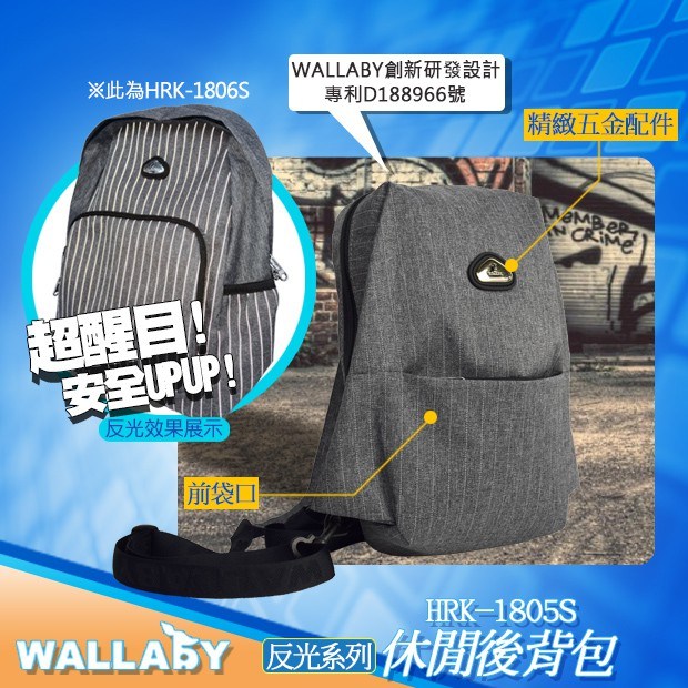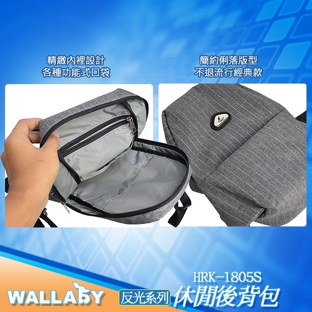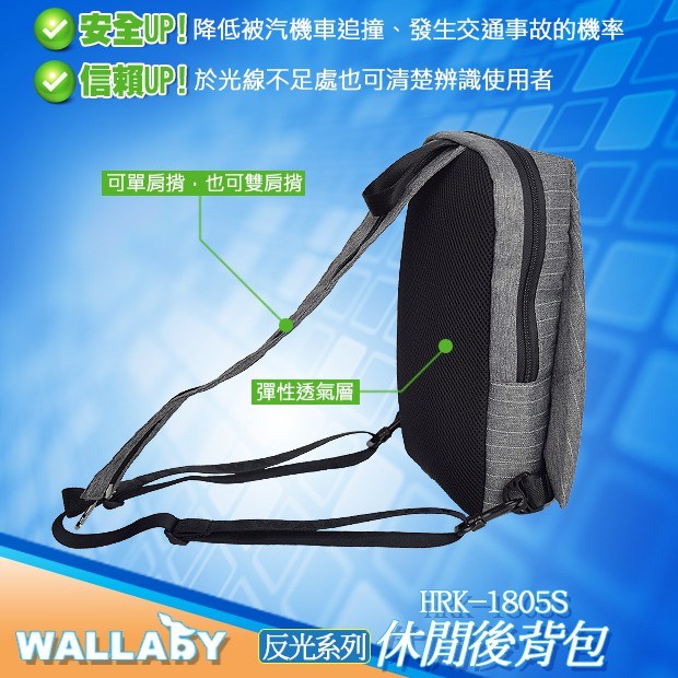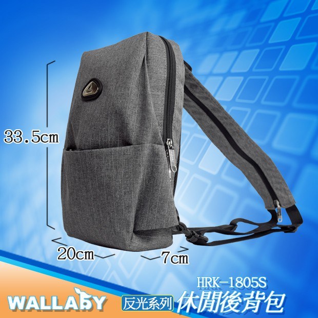 WALLABY反光背包,HRK-1805DL,是一款時尚又實用的休閒背包。這款藍色背包尺寸為20 x 33.5 x 7公分,重量僅400克,輕巧便攜,適合日常使用或學生上學。採用特多龍反光布材質,不僅耐用,更能在夜間提供額外的安全性。無論是城市漫步還是戶外活動,WALLABY反光背包都能讓您安心出行,展現個人風格。