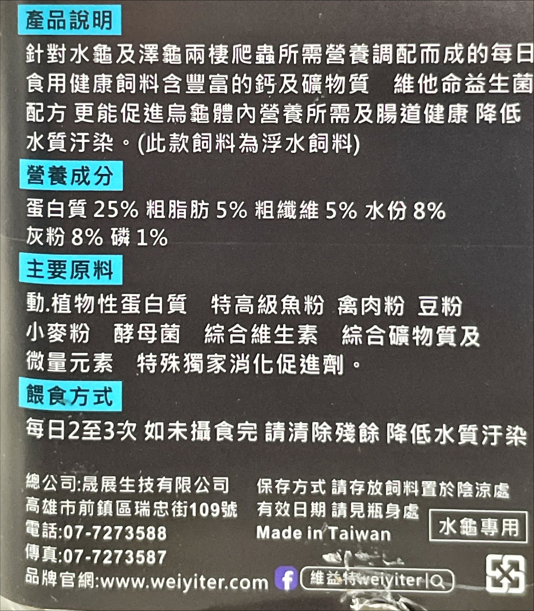 為您的水龜提供最佳的營養選擇!維益特水龜挑嘴全效浮水飼料,專為滿足水龜的營養需求而設計,不含人工防腐劑、色素和香料,確保您的水龜獲得最健康的飲食。飼料中添加了豐富的維生素和礦物質。顆粒大小為4mm,適合15cm或以上的水龜食用,浮水設計方便水龜進食,同時減少水質污染。選擇維益特,給您的水龜提供美味又營養的每一餐!